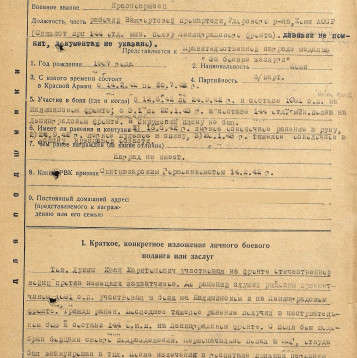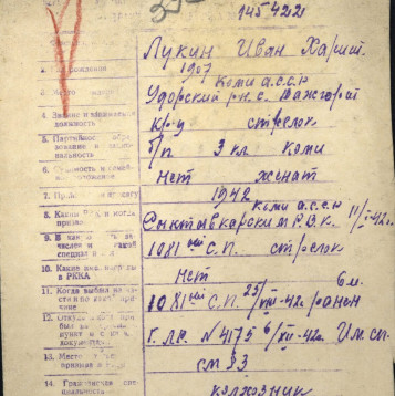 Лукин Иван Харитонович,26.09.1907-23.11.1946г.р.- мой дедушка. Родился в с. Важгорт Удорский р-н Коми АССР. Жена Попова (Лукина) Августа Андриановна. До войны дед работал в колхозе «Партизан» бригадиром полеводства. На войну был призван 11.01.1942 Сыктывкарским РВК, Коми АССР, г. Сыктывкар. Дата поступления на службу 14.02.1942. Воевал в 1081 СП 312 дивизии и в 144 оминп 28 дивизии на Ленинградском Фронте. Принимал участие в боевых действиях на Смоленщине, д.Прилепы Кармановского р-на. После этих боев Лукин Иван Харитонович был ранен и ошибочно причислен в погибшим. Попал в госпиталь. После лечения в начале декабря 1942 года он снова был отправлен на фронт в качестве связиста в составе 144 отд.мин.полка 28 дивизии Ленинградского фронта. Здесь он получил тяжелое ранение в спину, был комиссован и инвалидом 2 группы отправлен домой. В последующем (09.1943года) Удорским РВК было написано сообщение в Центральное бюро по персональному учету потерь личного состава Красной Армии в г. Москва о том, что оказались живыми следующие красноармейцы, в том числе указан и мой дед. Бабушка получала 3 похоронки на мужа. Он был трижды ранен, но, главное, живой. Дедушка вернулся и начал работать на локомотиве в сельхозартеле с.Важгорт Удорского р-на Коми АССР. Лукин Иван Харитонович 12.08.1944 года был представлен к награде Удорским РВК, а 06.08.1946 года был издан указ№ 504/57 Президиума Верховного Совета о награждении орденами и медалями СССР офицерского, сержантского и рядового состава, в том числе и моего деда (стр.110 Указа).