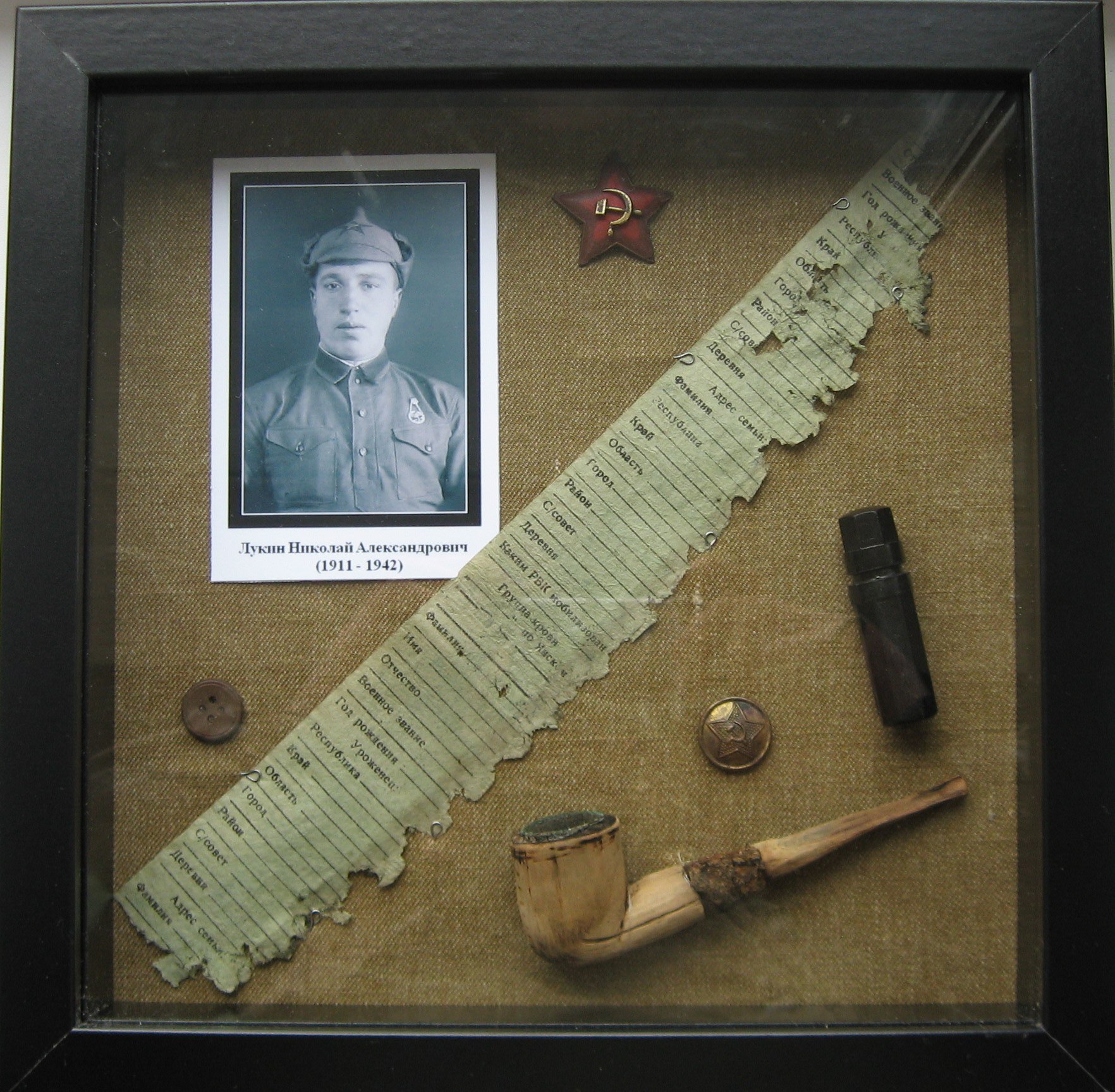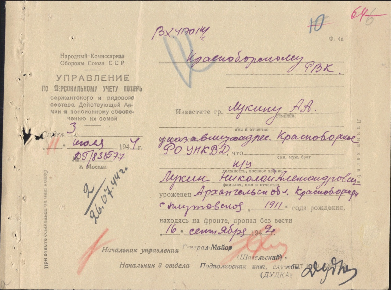 Находясь на фронте пропал без вести 16.09.1942 год, под Ленинградом, восточная окраина ст. Апраксин. Найден поисковым отрядом "Русь", в 2015 году. Предан земле на воинском мемориале "Синявские высоты" , 7 мая 2016 года .Записан в боевую летопись обороны и освобождения Ленинграда и Отечества.