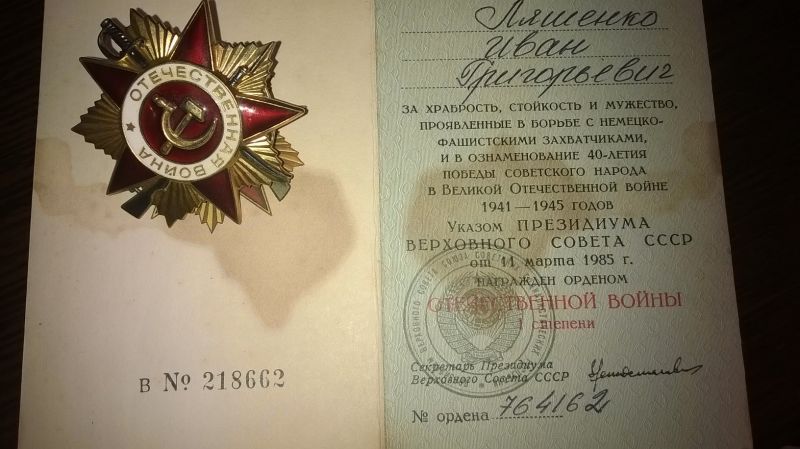 Мой дедушка - красноармеец Ляшенко Иван Григорьевич, 07.02.1919 г.р., был призван в кавалерийский корпус сразу после начала войны. В 1944 году получил тяжелое ранение. В медчасти его приняли за умершего и положили на груду трупов погибших солдат. Когда принесли в морг очередного умершего, выяснилось, что солдат Ляшенко живой. Дедушка рассказывал: как шли в бой за Родину, за Сталина; как верили в Победу; про настоящую дружбу и любовь. Инвалидом 2 группы дедушка работал в тылу. За боевые заслуги перед Отечеством и самоотверженный труд был награжден Правительством. Хотя жил он от нас далеко, каждое лето мы приезжали к нему в гости и он рассказывал о войне. Нет, скорее - о Победе над фашизмом! Умер он в мирное время 11 апреля 2013 года в Украине, Донецкой области, г. Амвросиевка. Не дожил до чудовищных событий, происходящих в настоящее время на Украине. Мы, дети, внуки и правнуки, гордимся нашим Героем! Спасибо тебе, наш родной! Мы помним!