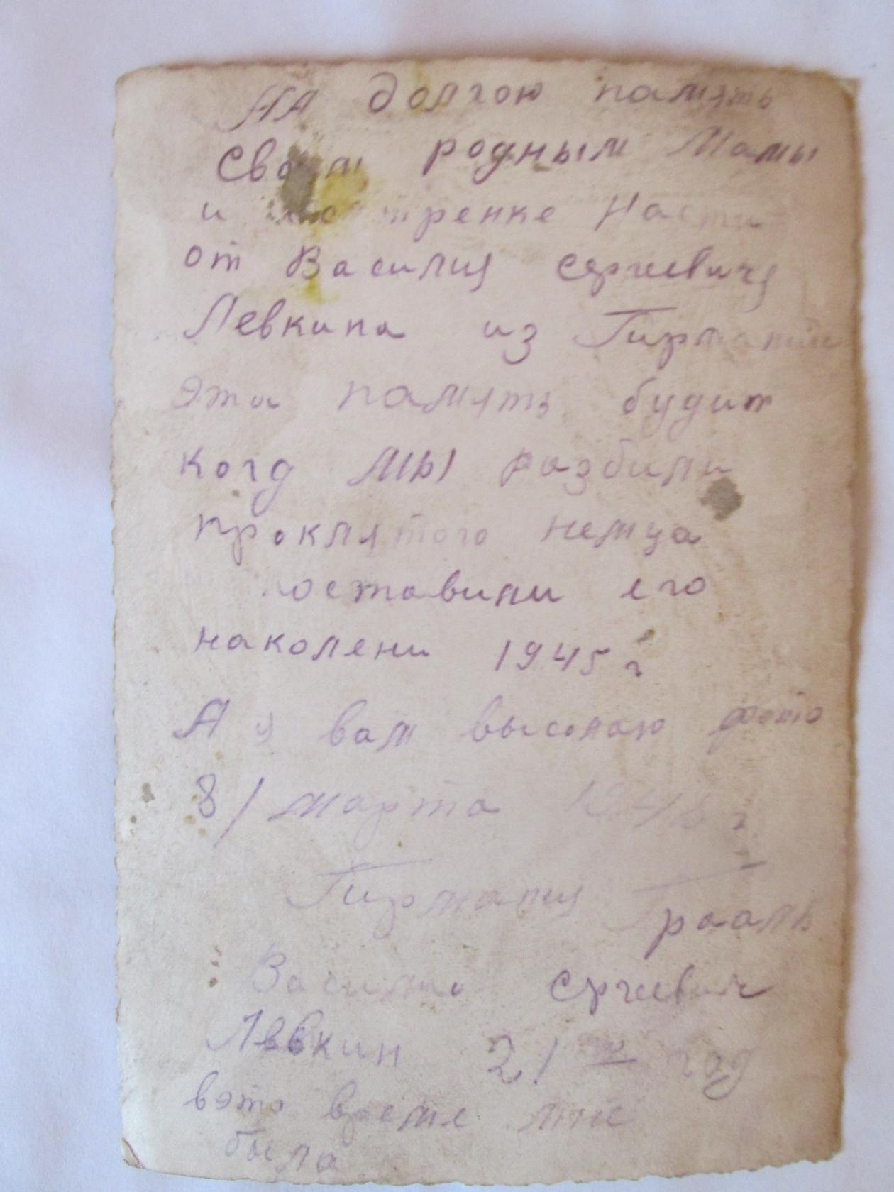 Лёвкин Василий Сергеевич участвовал в боях на Белорусском фронте,освобождал Варшаву,форсировал Вислу и Одер,участвовал в штурме Берлина.Был дважды ранен.Служил в Германии до 1947 года.