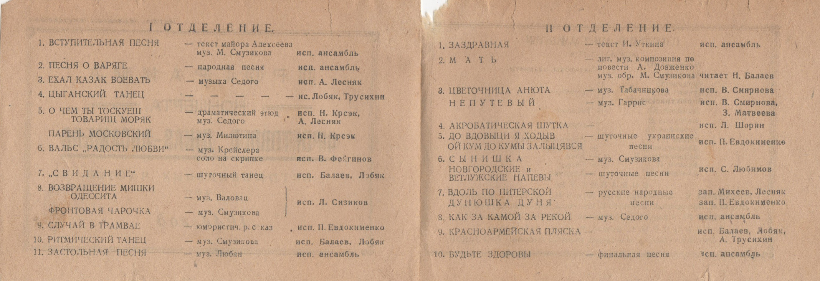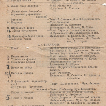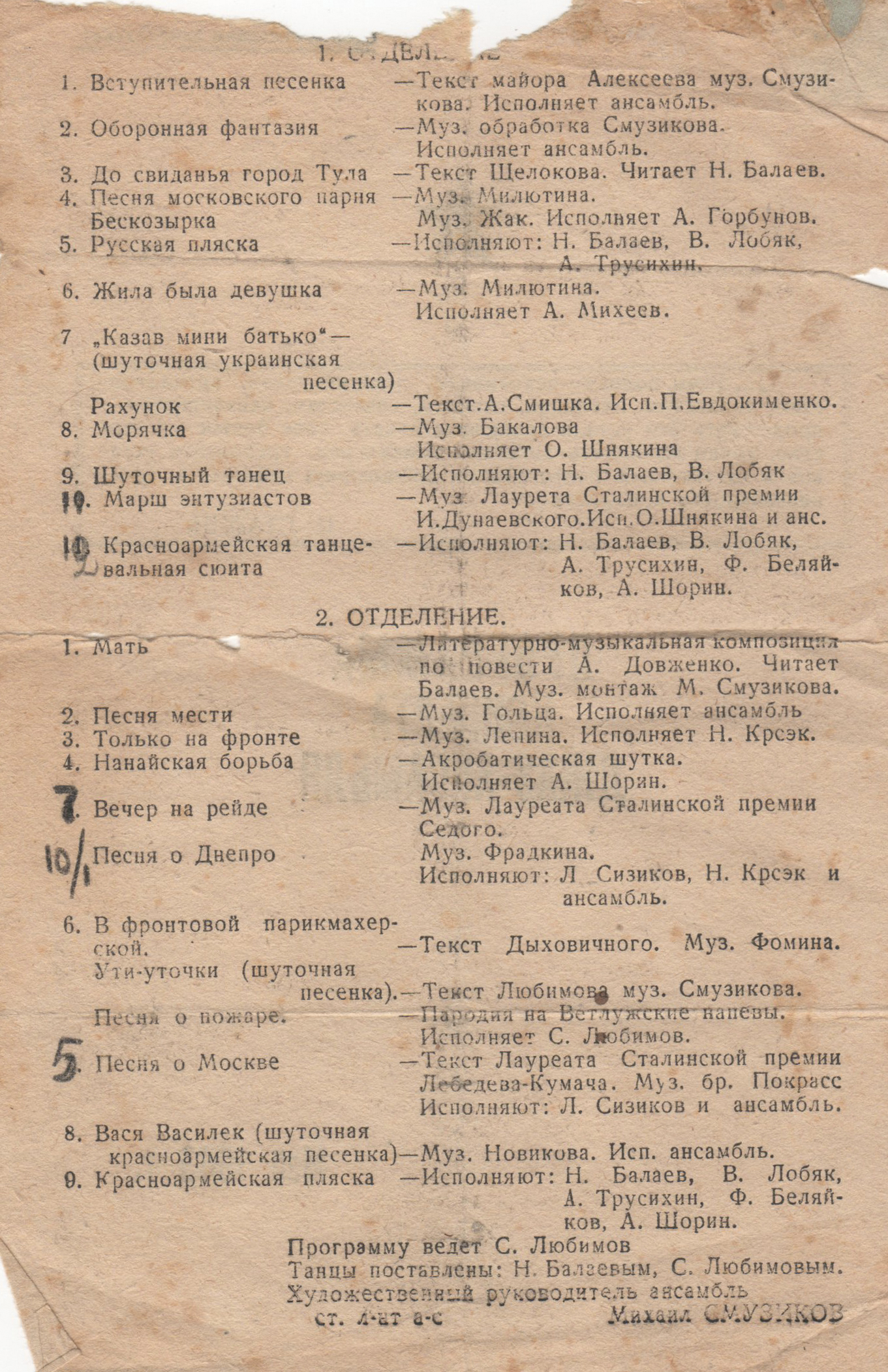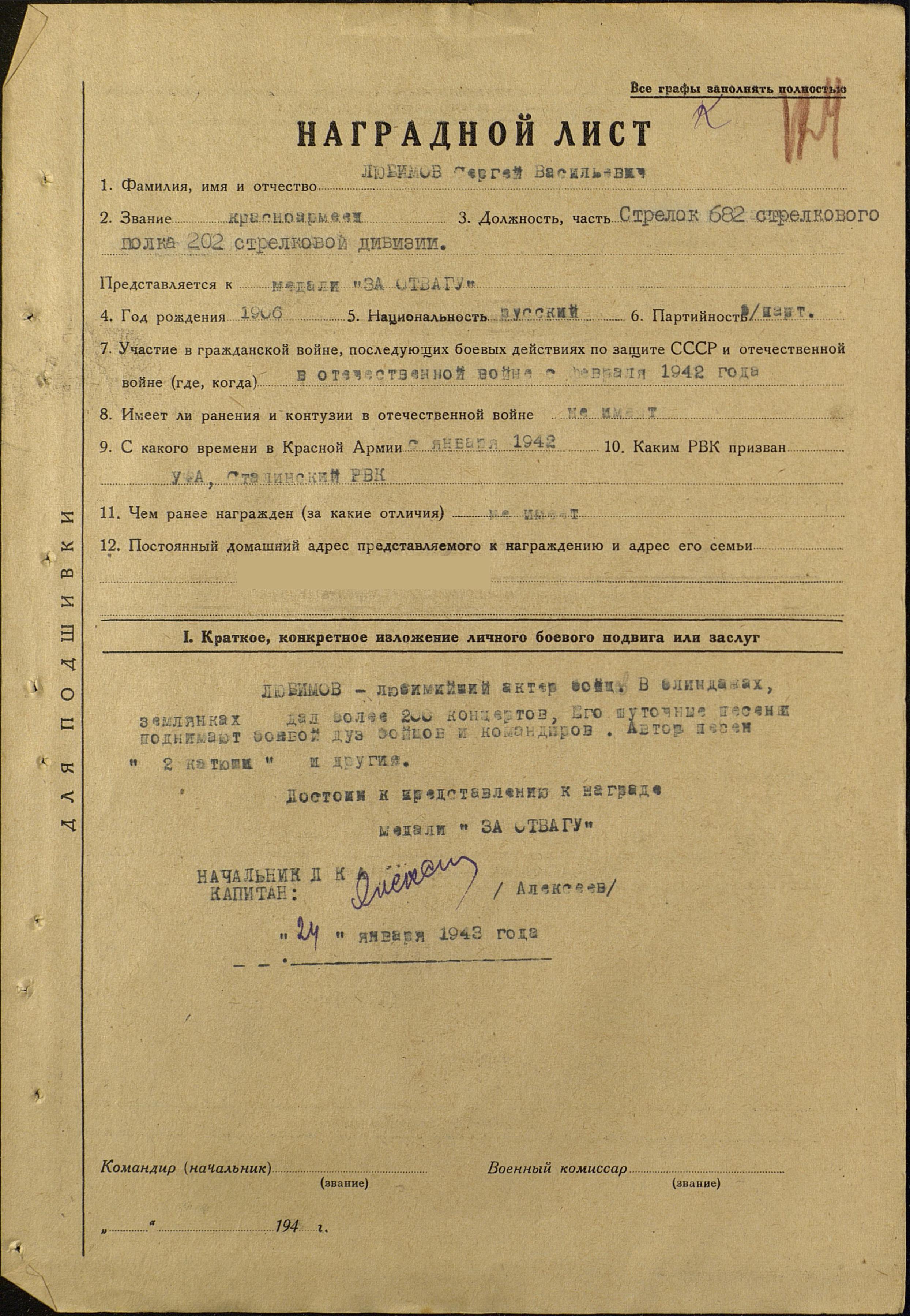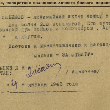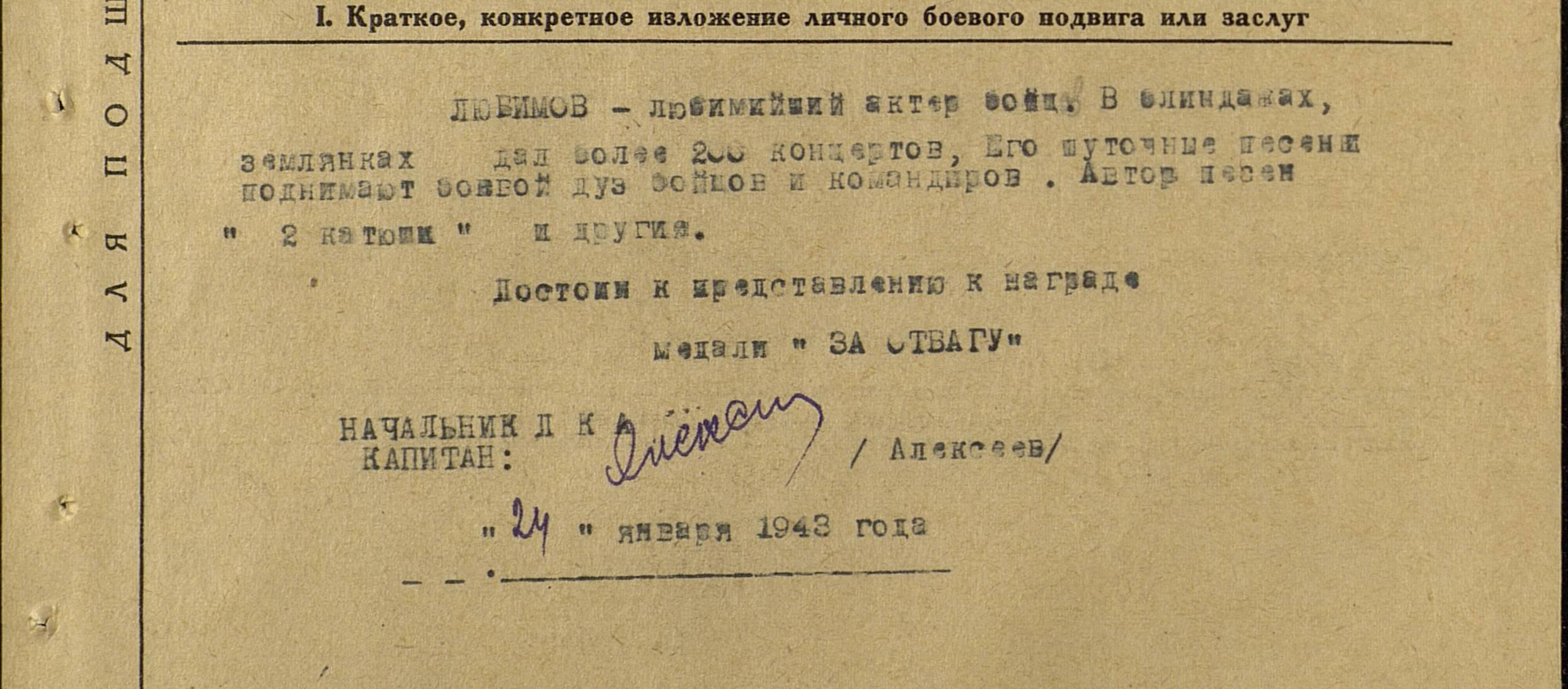 Любимов С.В.-любиминейший актёр бойцов.В блиндажах,землянках дал 200 концертов.Его шуточные песни поднимают боевой дух бойцов и командиров.Автор песен "2 катюши" и другие.Представлен к награде "За отвагу".( из наградного листа.)После войны работал клоуном в Московском ГосЦирке. Снимался в фильме "Косолапый друг","Старик Хотабыч".