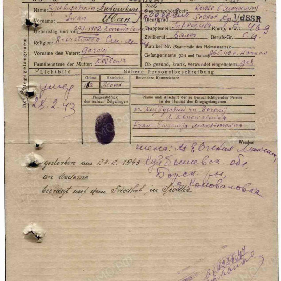 Любушкин Иван Гордеевич-красноармеец 462 СП 168-й СД попал в плен 26.05.42 года под Харьковом, направлен в шталаг-ivH(304).Погиб 28.02.43г и похоронен в Сиедлице. Этот фронтовик-мой односельчанин.