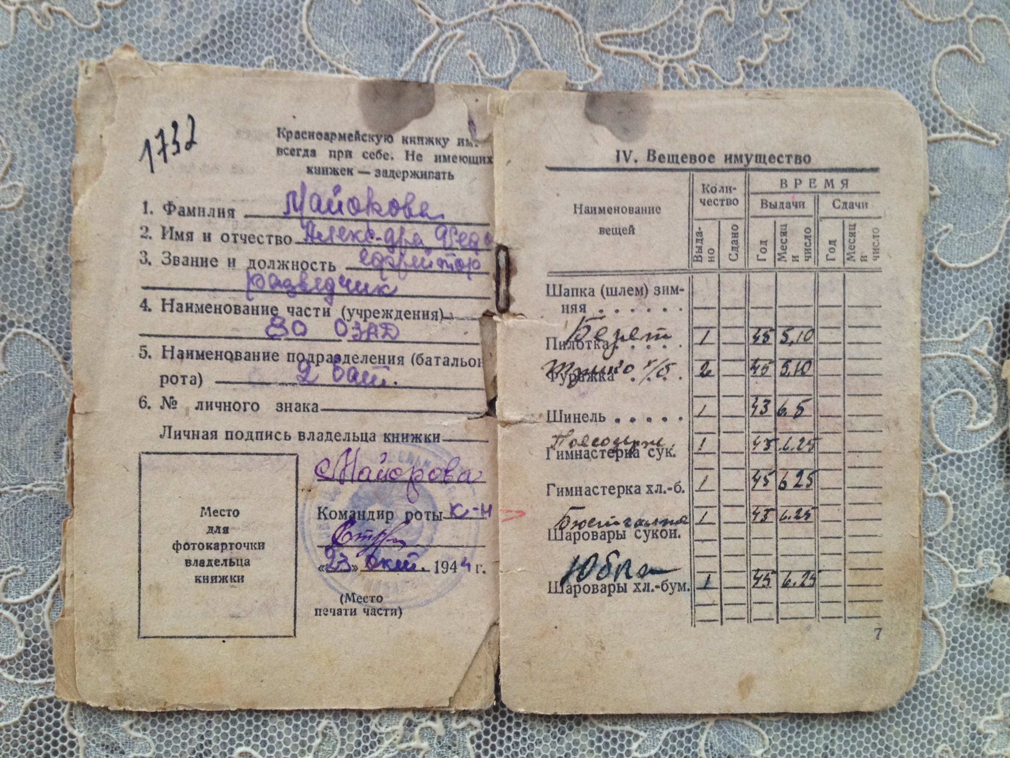 Призвали на фронт в 1942 году по мобилизации. Попала в зенитные войска. Звание и должность: ефрейтор-разведчик. Наименование части: 80 ОЗАД, 2 батальон. Участвовала в боях на Ворошиловском фронте с 01.12.1942г. по 07.01.1943г., на Западном фронте в 24.02.1943г., на Южном фронте в 15.01.1944г. Значок отличия ПВО.