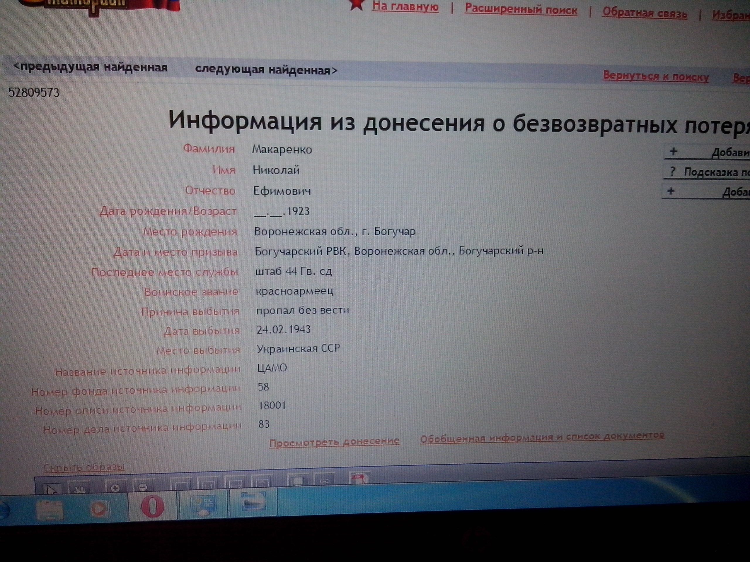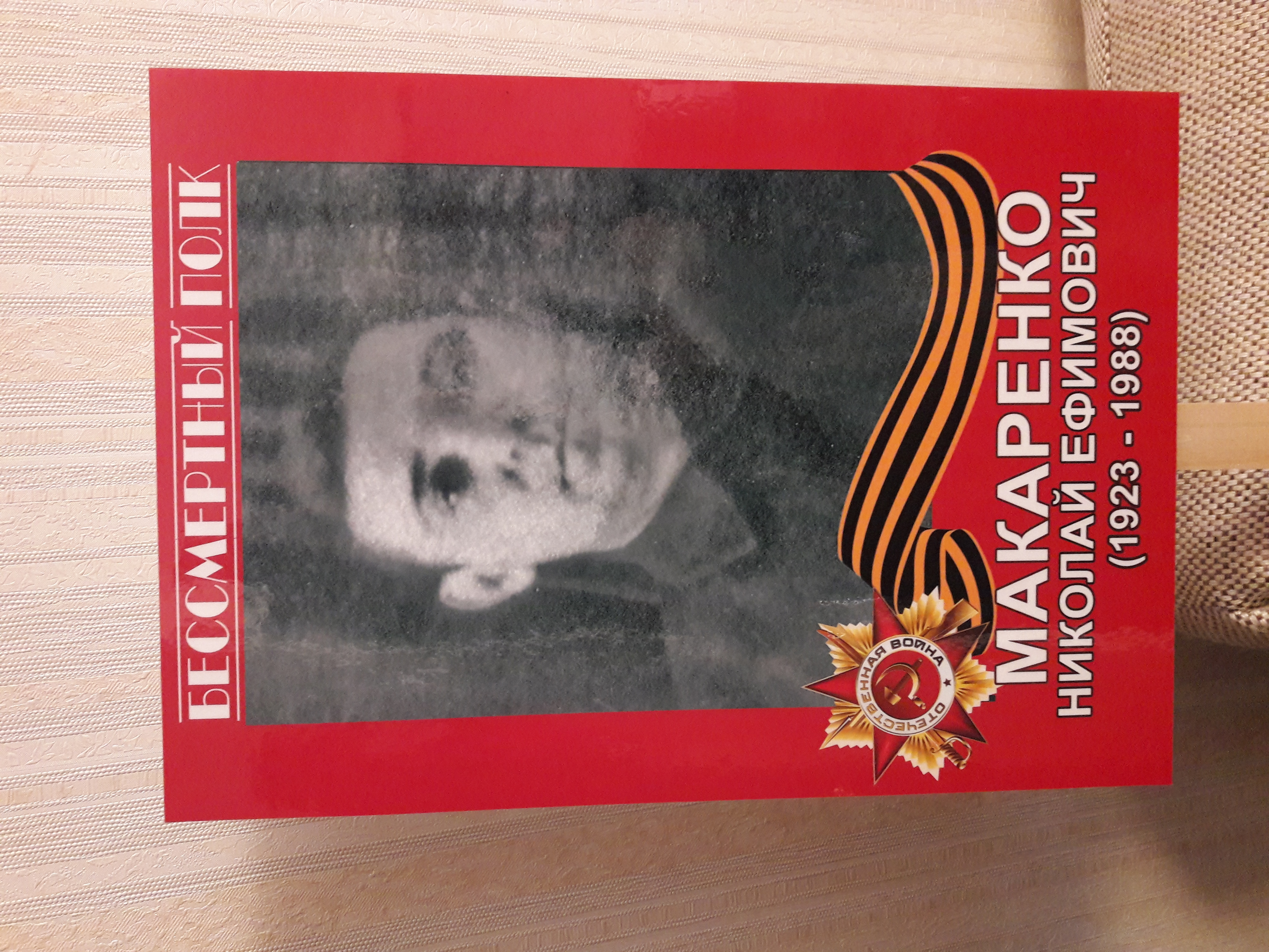 Мой дедушка, Николай Ефимович Макаренко родился в старинном провинциальном городке Богучар, что находится в Воронежской области в 1923 году, к сожалению не помню даты и месяца рождения. Призван в Армию был из Богучарскго РВК. В одном из документов из поисковика я узнала, что дед пропал без вести в феврале 1943 года, чему очень была удивлена. Дед прошел всю войну и дошел до Берлина. Был неоднократно ранен и осколки блуждали по его телу. К великому сожалению не помню названий всех его наград, его похоронили вместе с ними. Умер он 8 мая 1988 года от очередного движущего осколка, в месте которого началась гангрена. от операции дед отказался, точнее сбежал с больницы. Он решил, что солдату и на том свете нужны две ноги. Хоронили мы его
