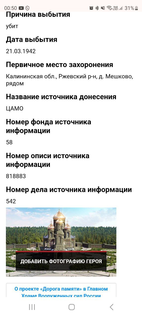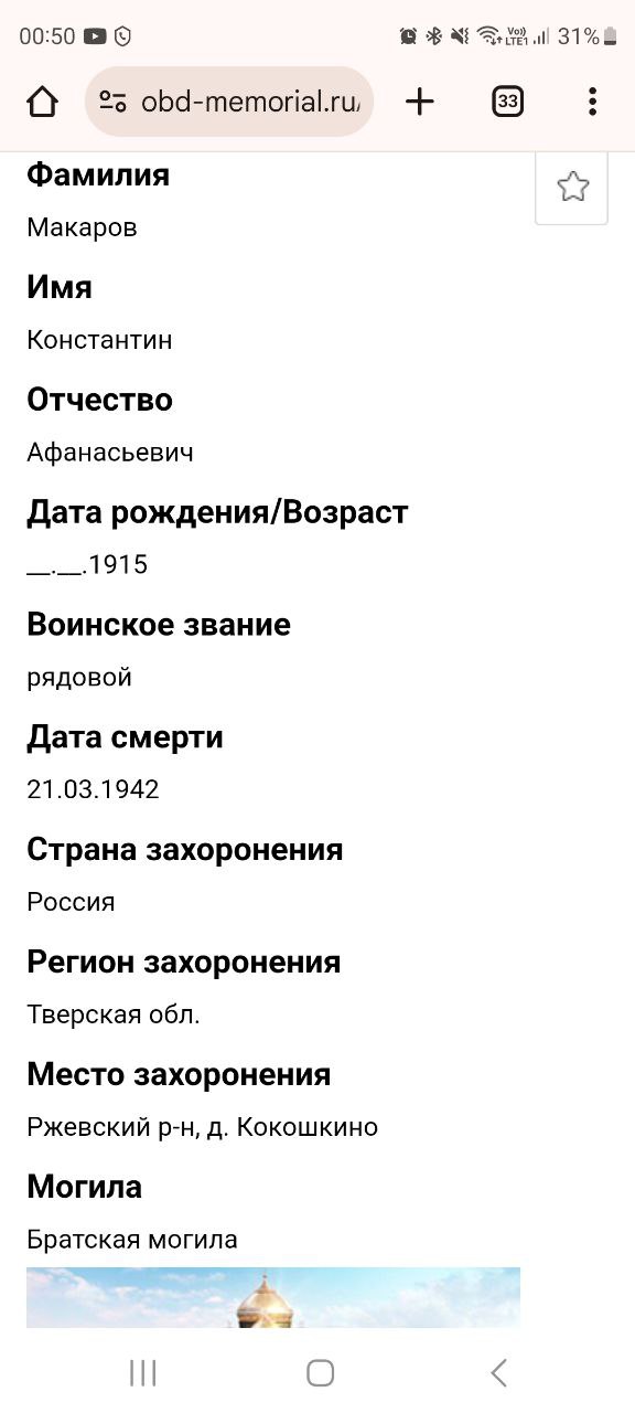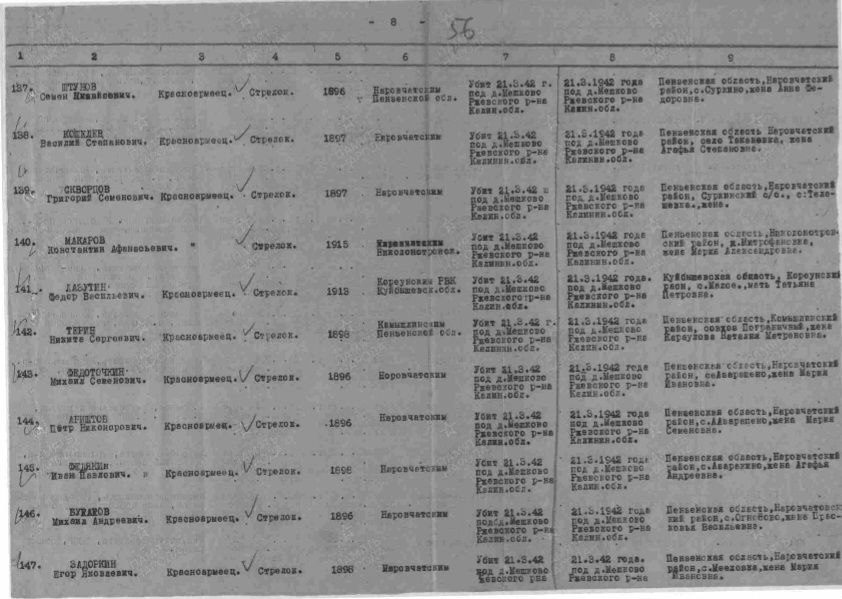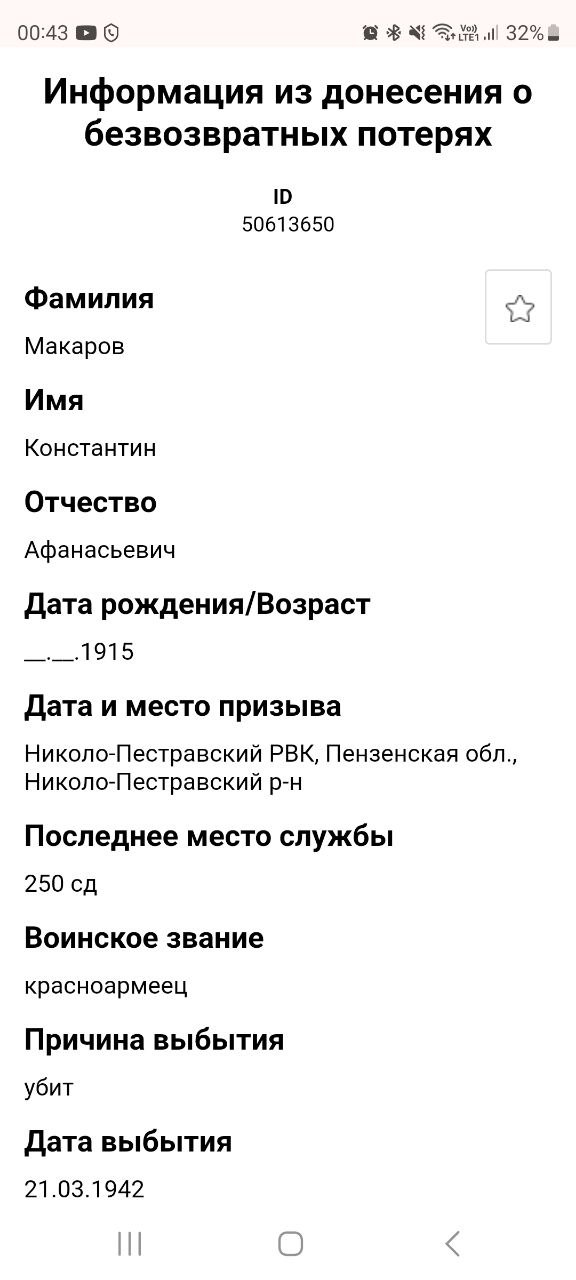 Макаров Константин Афанасьевич родился в 1915 году в д. Митрофановка Пензенской области. 15.01.1938 заключил брак с Михалкиной (Макаровой) Марией Александровной (14.07.1914 - 03.05.1997 - 83 года). (Аловский сельский совет, Никольский район, Пензенская область. Был призван рядовым на фронт. Воевал в 250 стрелковой дивизии по специальности стрелок. С января по март 1942 года участовал в наступательных и оборонительных боях в районе Ржева. Умер 21 марта 1942 (27 лет) под д. Мешково Ржеского района Калининской области. Перезахоронен в Братской могиле в Тверской области, Ржевского района, д. Кокошкино. Имел 1 сына - Макарова Михаила Константиновича (14.09.1939 - 02.08.1991 - 52 года).