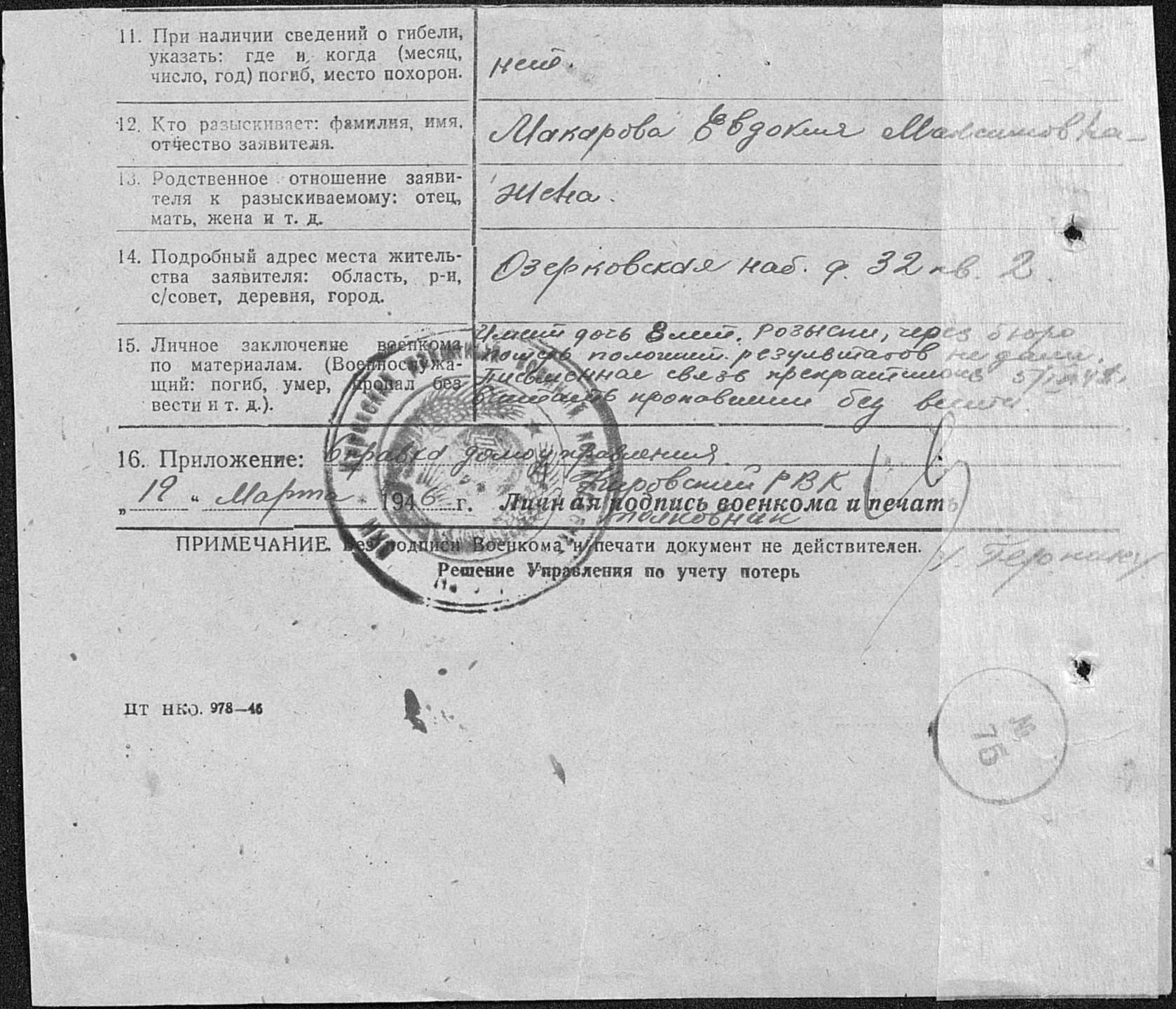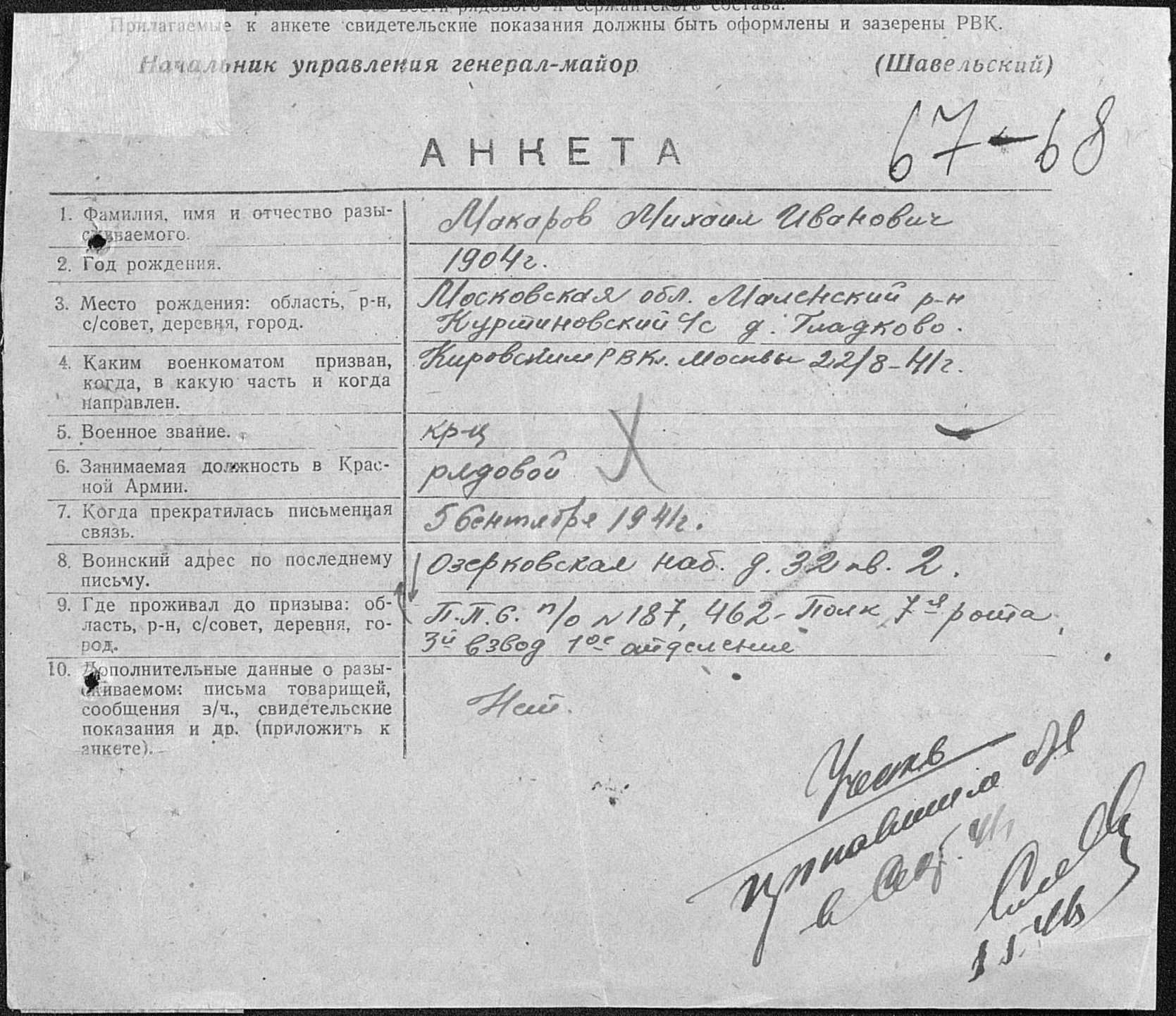 Боевой путь ветерана адрес проживания до войны: г.Москва, Озерковская набережная, д.32, кв.2                                                                                                 жена: Макарова Евдокия Максимовна                                             дочь: Макарова (Ломова) Людмила Михайловна 1938г.р. - моя мама