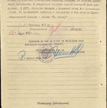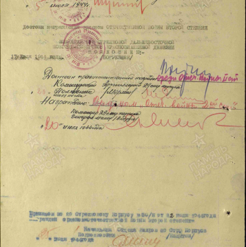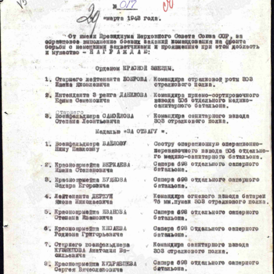 639 лёгкий артиллерийский полк 181 стрелковой дивизии Северо-Западного фронта; 318 стрелковый полк 241 стрелковой дивизии; 303 стрелковый полк 241 стрелковой дивизии; 39 отдельный истребительный противотанковый дивизион 102-ой стрелковой дивизии 1-го Белорусского фронта.