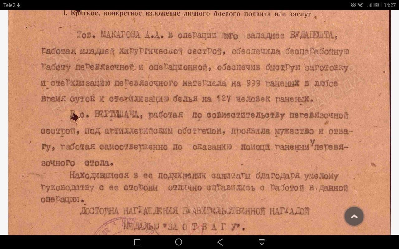 Моя бабушка Макарова (по мужу Лебедева) Анна Алексеевна была призвана на фронт в декабре 1942 года по достижении ею 18 лет. Прошла всю войну в составе 3-го Украинского фронта. Участвовала в Сталинградской битве, в боях за освобождение юга Украины, а также в боях за освобождение Будапешта (Балатонская операция), Варшавы, Праги, Вены. Победу встретила в Вене (Австрия). Благодаря бабушке я знаю о Великой Отечественной Войне с точки зрения самих участников. Ее рассказы бесценны и будут передаваться в моей семье из поколения в поколение. Вечная слава героям Великой Отечественной Войны!