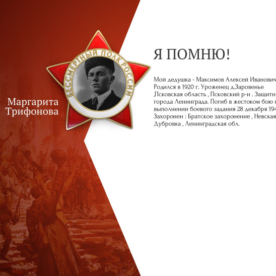 города Ленинграда. Погиб в жестоком бою при выполнении боевого задания 28 декабря 1941 г. Захоронен : Братское