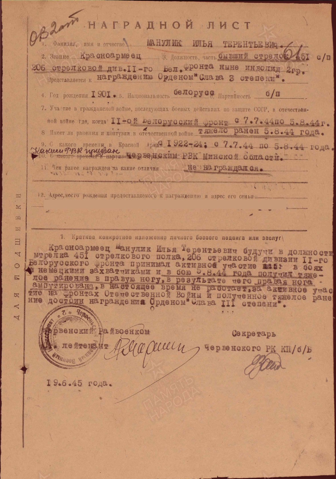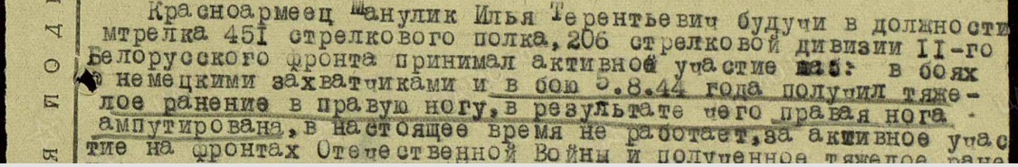 Красноармеец Манулик Илья Терентьевич будучи в должности мтрелка 451 стрелкового полка, 206 стрелковой дивизии 11-го Белорусского фронта принимал активное участие ная: в боях немецкими захватчиками и в бою 5 .8.44 года получил тяжелое ранение в правую ногу в результате чего правая нога ампутирована