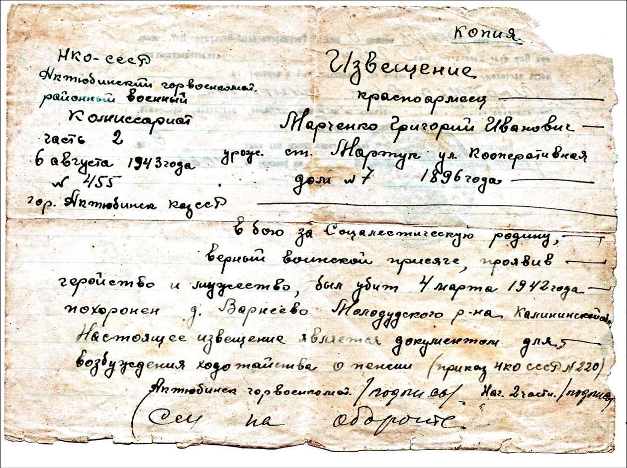 Боевой путь ветерана На начало Великой Отечественной войны проживал в пос. Мартук Мартукского района Актюбинской области Казахской ССР. Мобилизован 25 января 1942 года, зачисле в 101 стрелковую бригаду. Погиб 4 марта 1942 года под дер. Ванеево Молодукского района Калининской области. Перезахоронен в братскую могилу в дер. Погорелки Ильченковского с/совета Ржевского района.