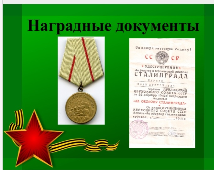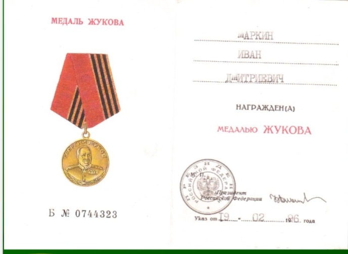 Маркин Иван Дмитриевич родился 24 сентября 1922 года в простой крестьянской семье Маркиных Дмитрия Алексеевича и Марии Прокопьевны в селе Кузнецкое. Семья была большая, в ней было семеро детей: четыре сына и три дочери. В 1930 году он пошел в школу, где закончил 6 классов. А в 1940 году был призван в ряды Красной Армии. Вскоре началась самая кровопролитная на нашей планете война. Фашисткая Германия вероломно напала на нашу страну – 22 июня 1941 года. Здесь Ивану Дмитриевичу пригодился опыт комбайнера – специальность, которую он освоил незадолго до призыва в армию, на уборке урожая в родном селе. С первых дней войны Иван Дмитриевич на своей машине ЗИС-5 обеспечивал фронт боеприпасами, продуктами, материалами для строительства мостов, блиндажей и укрытий. Так продолжалось до того момента, когда началось одно из самых крупных сражений за освобождение Сталинграда (лето 1942 года). Район Сталинграда особенно привлекал гитлеровцев. Сталинград – это крупный промышленный центр нашей страны. Захват Сталинграда врагом значительно ослабил бы Советскую Армию и страну в целом. Во время этих боев требовалось особенно много снарядов и других материалов. Водители работали день и ночь без перерыва, обеспечивая наши войска всем необходимым. В один из таких дней Иван Дмитриевич Маркин вёз снаряды для наших артиллеристов. Внезапно показались вражеские самолеты, которые начали обстрел машины с боеприпасами. При одной из атак немецкая бомба попала в машину и взорвала её. Иван Дмитриевич чудом остался жив – его выбросило из кабины взрывной волной, но он был тяжело ранен. Спас его, вытащив из-под огня, боевой товарищ – Иван Скрипченко. Затем был госпиталь. Выздоровление. Снова фронт. Битва на Курско-Орловской дуге (лето 1943 года). В одном из боев под Старой Руссой Иван Дмитриевич был снова ранен и попал снова в госпиталь. Как только Иван оправился от болезни, он поспешил обратно в свою автороту. Вместе с верными боевыми товарищами он участвовал в тяжелейших боях, пока они не выбили фашистов с родной земли, за государственную границу Советского Союза. Война для Ивана Дмитриевича закончилась в Польше, на территории которой он еще прослужил два года, после чего вернулся домой, где его с нетерпением ждали родные и близкие. За участие в Великой Отечественной войне Иван Дмитриевич награжден Орденом Отечественной войны I степени, медалями «За отвагу» и «За оборону Сталинграда», а также другими правительственными наградами. Со своим другом Иваном Скрипченко Иван Маркин после войны ещё долгое время переписывался. Вернувшись домой, Иван Дмитриевич до выхода на заслуженный отдых работал водителем. Помогал своим землякам в поселке Тайгинка строить дома, возил на железнодорожную станцию графит с графито-каолинового комбината. Стаж за рулем Ивана Дмитриевича составил более 50 лет, за что он неоднократно награждался грамотами. У Ивана Дмитриевича Маркина очень большая семья три дочери и один сын, которые подарили ему семерых внуков. Успел он повидать и первых правнуков. Иван Дмитриевич прожил непростую жизнь, познав горечь испытаний, лишений и страх перед лицом смерти, не раз заглядывавшей ему в глаза. Но даже эти суровые испытания не смогли погасить в нем огонь доброты и отзывчивости. Он всегда был готов протянуть руку помощи тем, кто нуждался, и никогда не проходил мимо чу