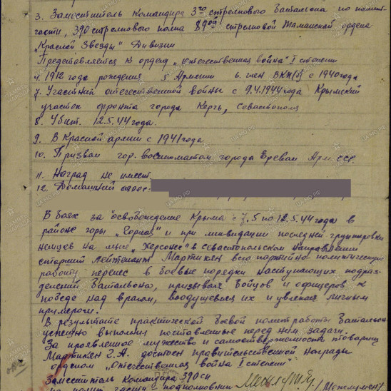Гевонд Арутюнович Мартикян родился В Запододном Армении нынешний (Турция)Арапкир . ещё ребенком пришлось покинуть свою родину из за геноцида Армян в 1915 году и поселились в Армянском ССР город Еревна . там же встретил свою Любимую Эмму которая родила сына Мелса1937. 21.11 и дочку Земфиру но по иронию судьбы Эмма погибла при родах дочери 1941 год 8 августа . В том же году Гевонд пошёл на фронт с младшим братом Суреном Сурен так же пропал без вести в Керче . и Гевонд больше не вернулся домой оставив дома подростка сына и малую новорожденную дочку. через два года дочку отдают в дет дом и она растет в одиночестве Земфира моя Мать которая всю жизнь хроня чёрный листок о пропавшом без вести Отца надеялась что найдется Отец. разные сказки росказовали люди то что его видели в плену то что он с плена сбежал в США и не как не могли узнать правду потому что наша советская власть под грифом секретно скрывала о политработников тем самым розрушая жизнь таких как моя Мать.Земфира так и не увидела те документы подтверждая гибель Отца и о орден Отечество втарой степени не знала что Я ее сын и внук моего Легендарного деда всетоки докопаюсь почти к истину и вот вот нойду магилу его и возлажу цветы и дам честь и дань что он заслужил, Я поражаюсь тех Ветеранов которые служили с моим дедом но не в каких мемуаров не где не упаминовался Имя Гевонда притом Офицера политработников красной армии и еще какой армии легендарного Таманской дивизии а себя нозыаают бойцами хотя даже не знали о таком человеке . Я обращаюсь Российской Федерации и президента Путина так как Крым по сути ваш и мой Дед погиб за вашу страну то дайте возможность знать где похоронен мой дед хватит вашых шпионских секретности , давно нету коммунизма и нету Советского союза дайте нам простым смертным дать дань нашым героям и возложить цветы на их могилах. Вы отобрали у моей Матери Отца и не дали возможность покланится ему так хотя внукам этих героях дайте эту возможность .Честь и слава всем героям которые не пришли домой и не увиковечились Имена в доске почета!!! но мы ваши внуки и правнуки помним и любим !!!