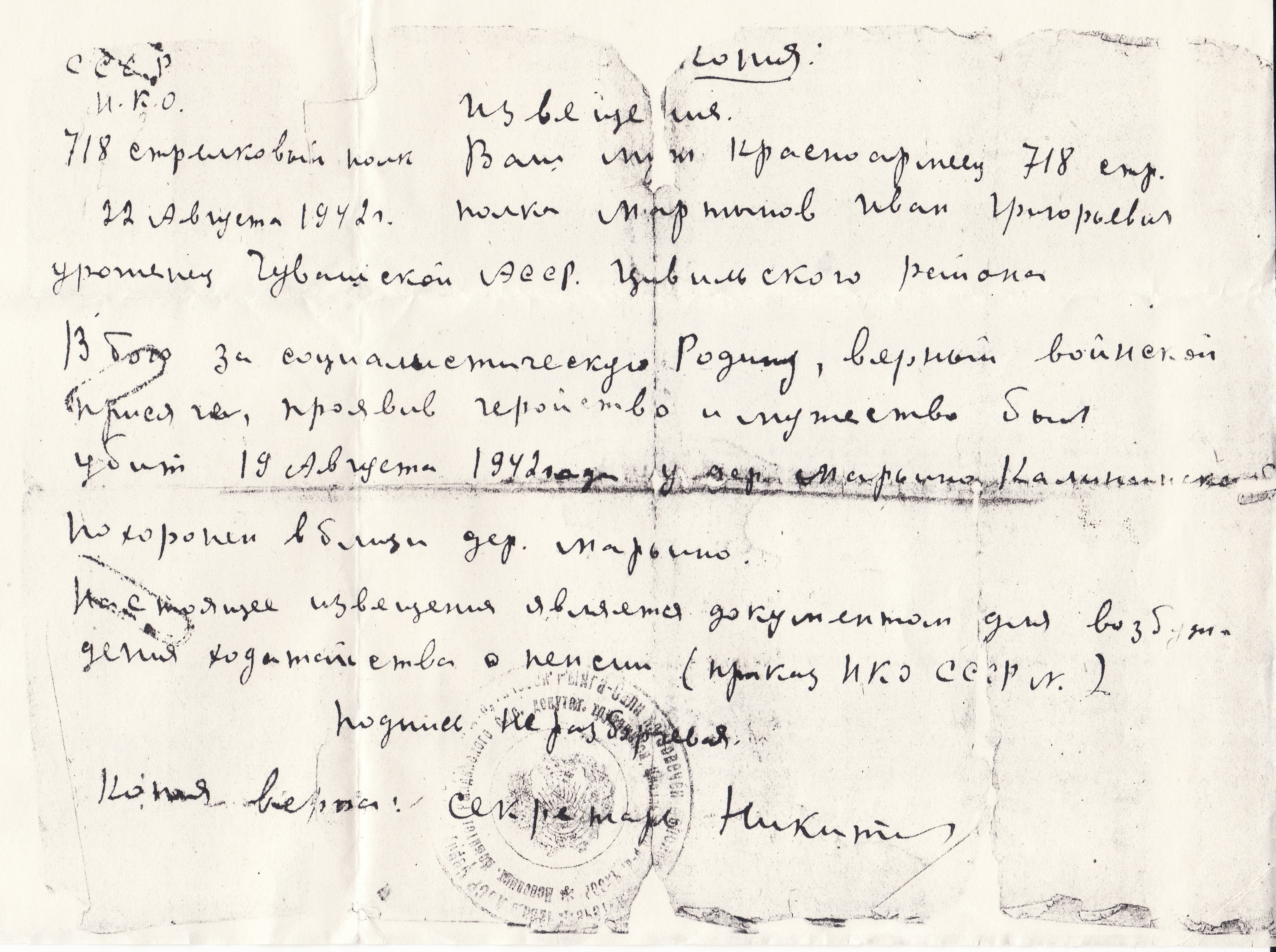 мужество 19 августа 1942 года (извещение от 22 августа 1942 года СССР П.К.О. 718 стрелковый полк).