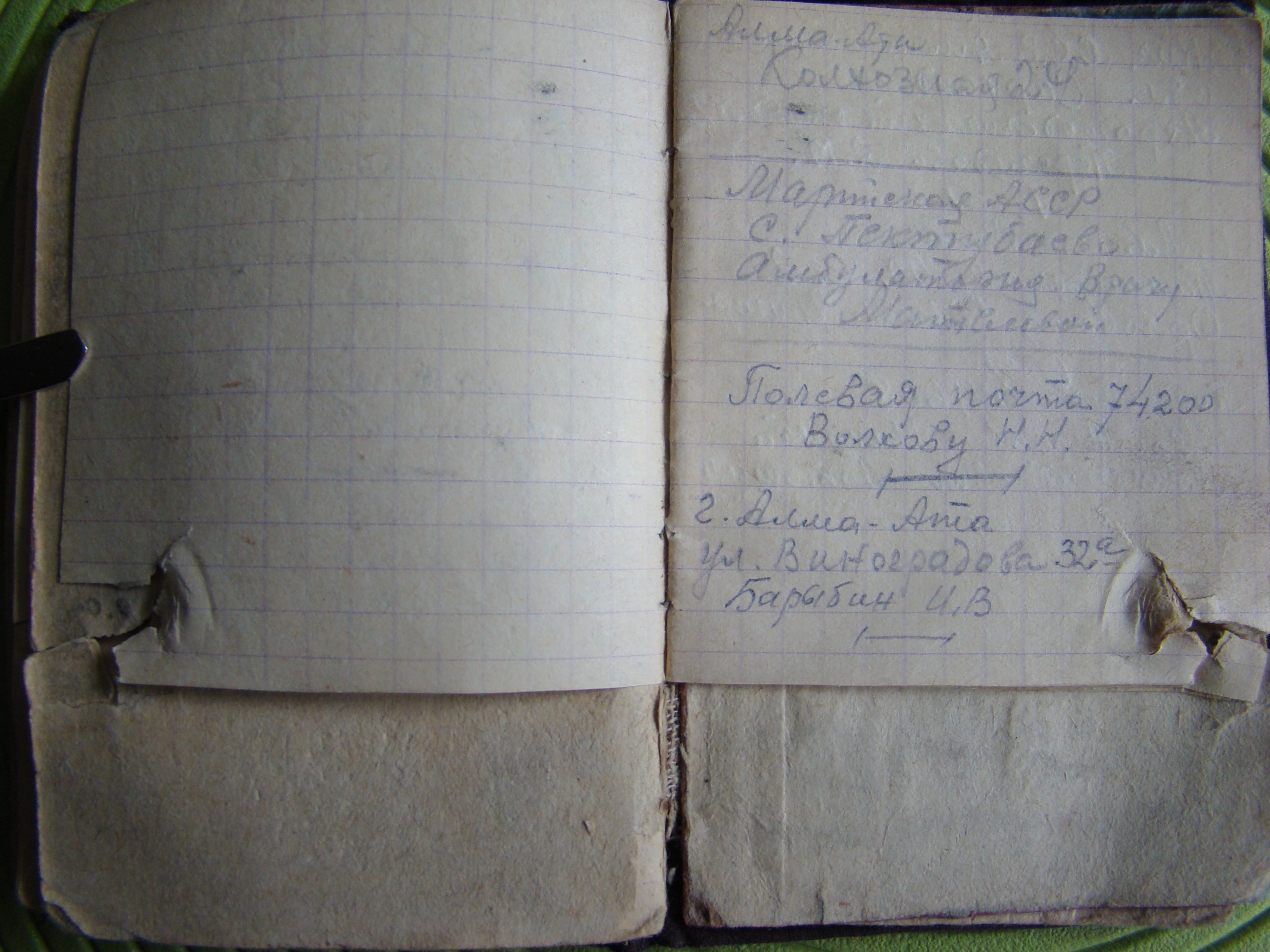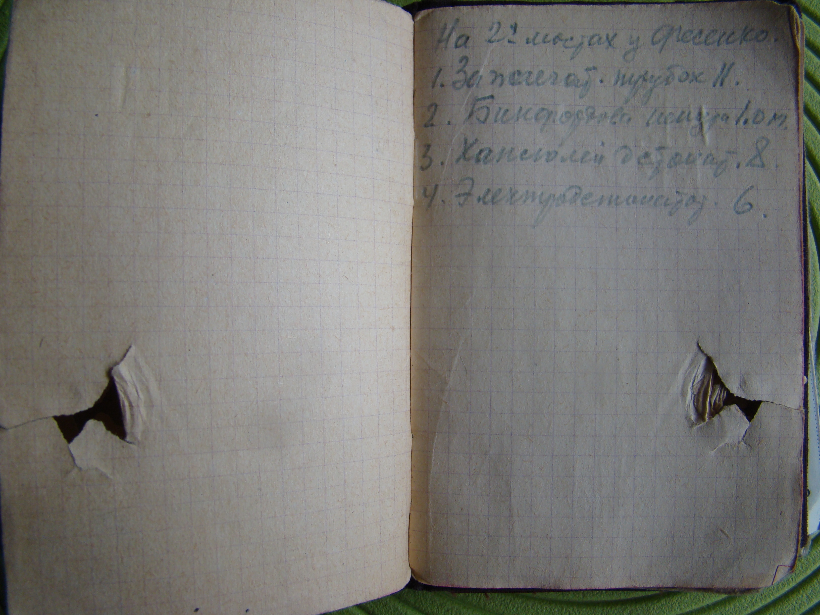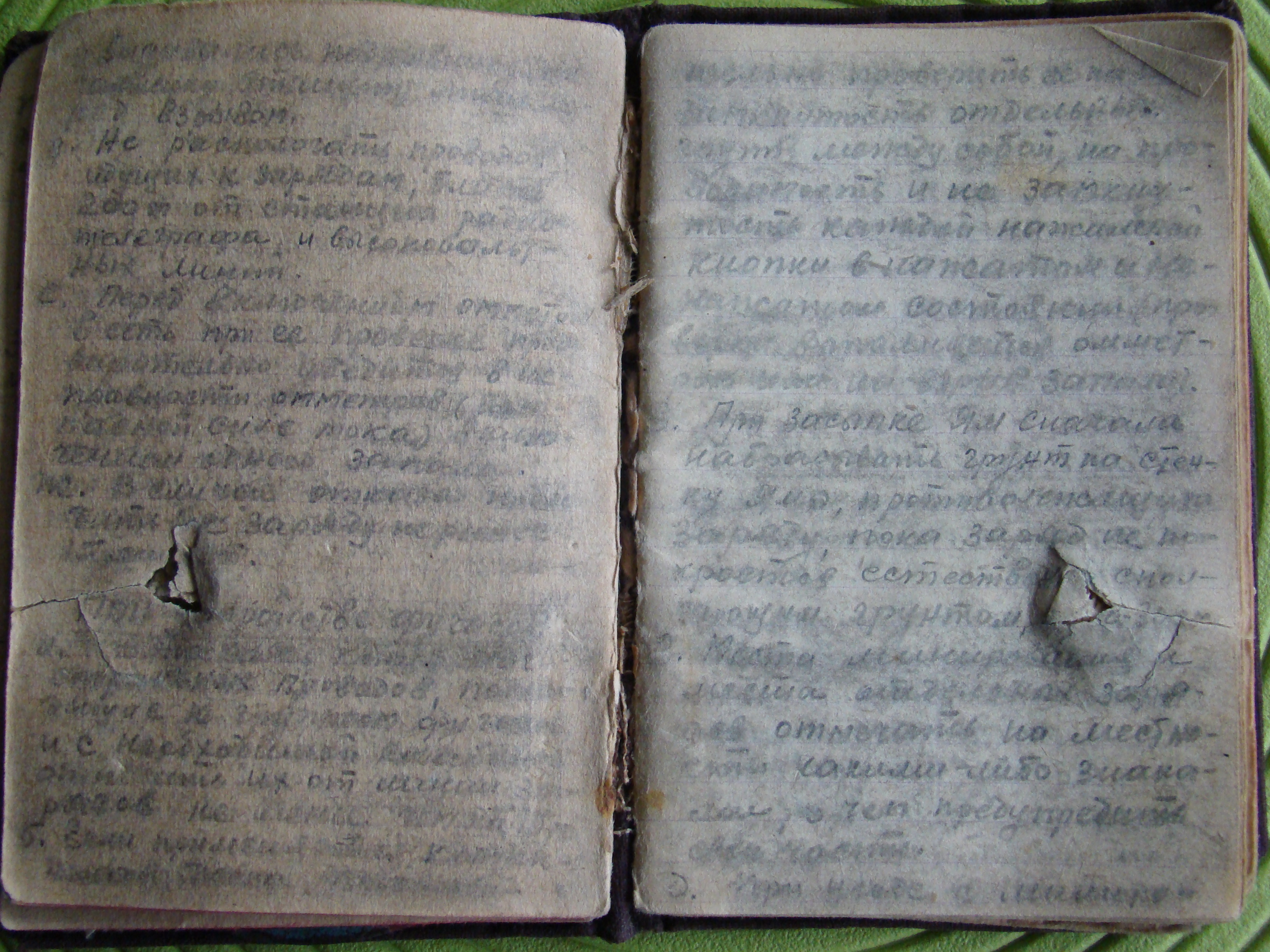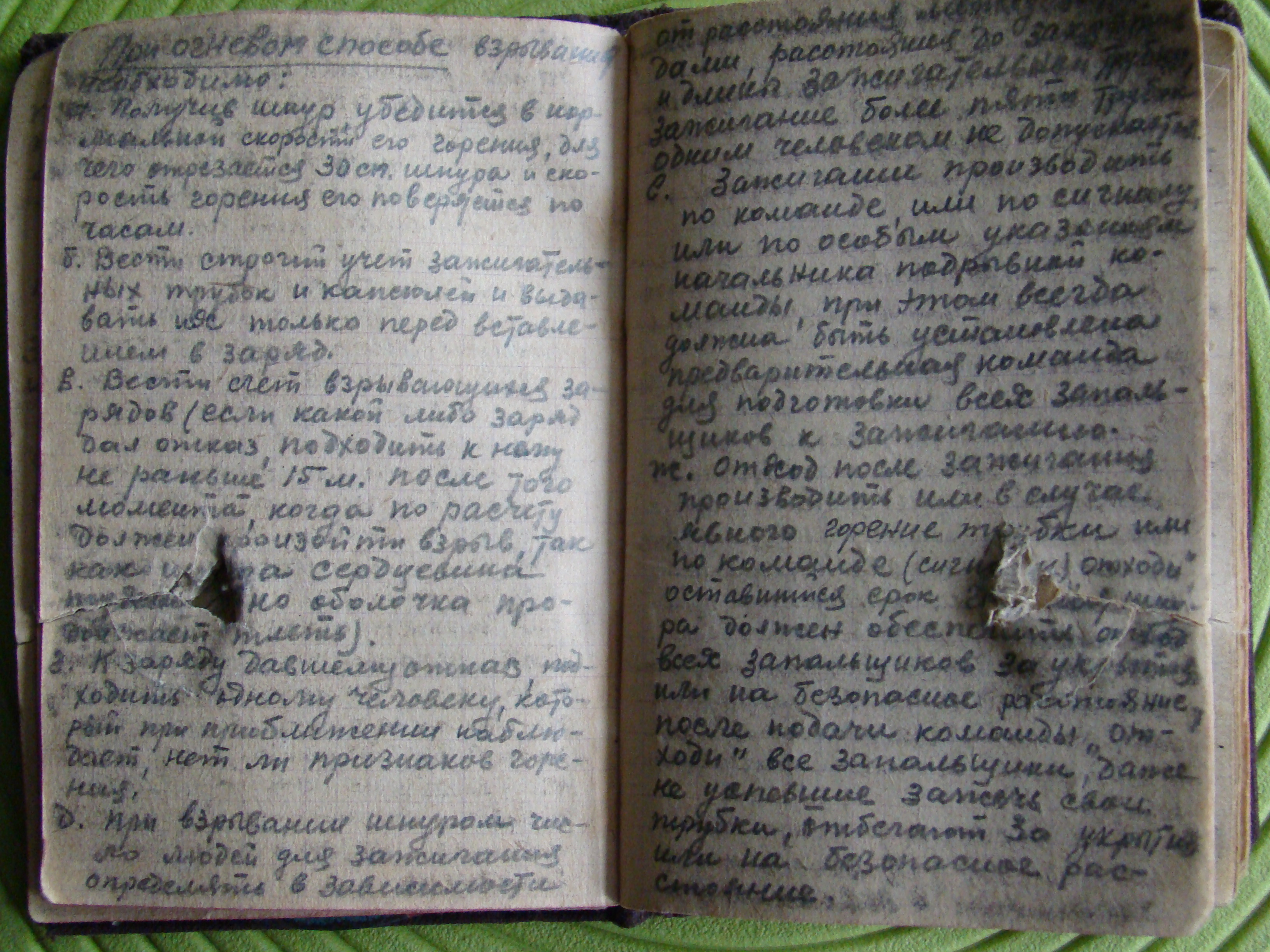 Мой дедушка - Матвеев Александр Васильевич, уроженец г. Юхнова Калужской области. Окончил Московский Инженерно-строительный институт (тогда - техникум)и на фронт призывался по специальности сапер. Дедушка много рассказывал о войне, сама специальность сапера предполагала опасность , буквально на каждом шагу. Подрывался он не один раз , лежал в госпитале, возвращался в строй, и только после ранения в голову его комиссовали, говорили, что долго не проживет, но он прожил до 1973 года. Но один случай с ним произошел и оценить его можно, как чудо. Дедушка был очень аккуратным и все записывал в записную книжку, там было записано все, что было связано с его военной работой, различные расчеты и рисунки. У него на фронте был кошелек, где на веревочке был привязан карандаш, резинка и маленький ножик. В записной книжке также располагался маленький металлический транспортирчик. Записная книжка находилась в левом кармане гимнастерки. По рассказам дедушки, в одной из боевых операций, произошел взрыв и он почувствовал сильный удар и боль в левой половине груди. "Н у все.....готов....", но через некоторое время он пошевелил рукой,....ногой, и с радостью обнаружил, что жив....Оказывается осколок прошел через записную книжку и "уперся" в маленький транспортирчик.... На месте удара был огромный синяк.... Все это мы бережно храним, правда осколок куда-то потеряли....