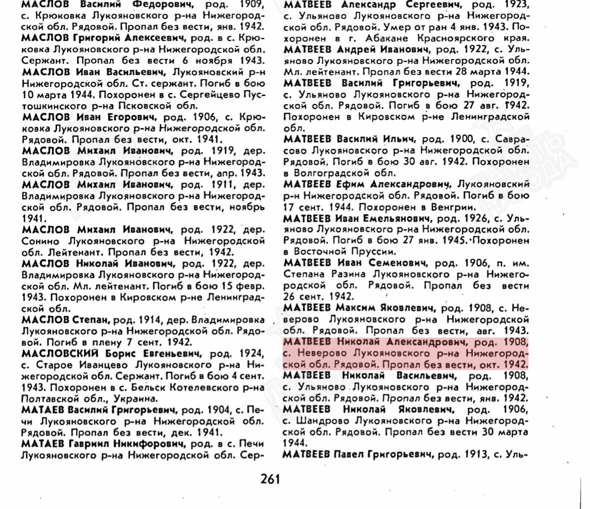 Матвеев Н.А родился в небольшом селе Неверово, Нижегородской (Горьковской) области. У него была жена Матвеева Домна Лукинична и дети Матвеева (Баринова) Таисия Николаевна, Матвеева (Мочалова) Анастасия Николаевна, Матвеев Виктор Николаевич. Николай Александрович был призван 26.06.1941 года. Последнее место службы 179 мед.сан.бат; должность - санитар. Из госпиталя было последнее письмо от 16.06.1942 года. Пропал без вести в октябре 1942 года. Предположительно 179 мед.сан.батальон входил в состав 137 стрелковой дивизии, которая на момент пропажи солдата, 28 апреля 1942 года участвовала в безуспешном штурме Мценска (Орловская область). В течение 1942 года держала оборону в том же районе. Вероятно в Орловской области и пропал без вести Матвеев Н.А.