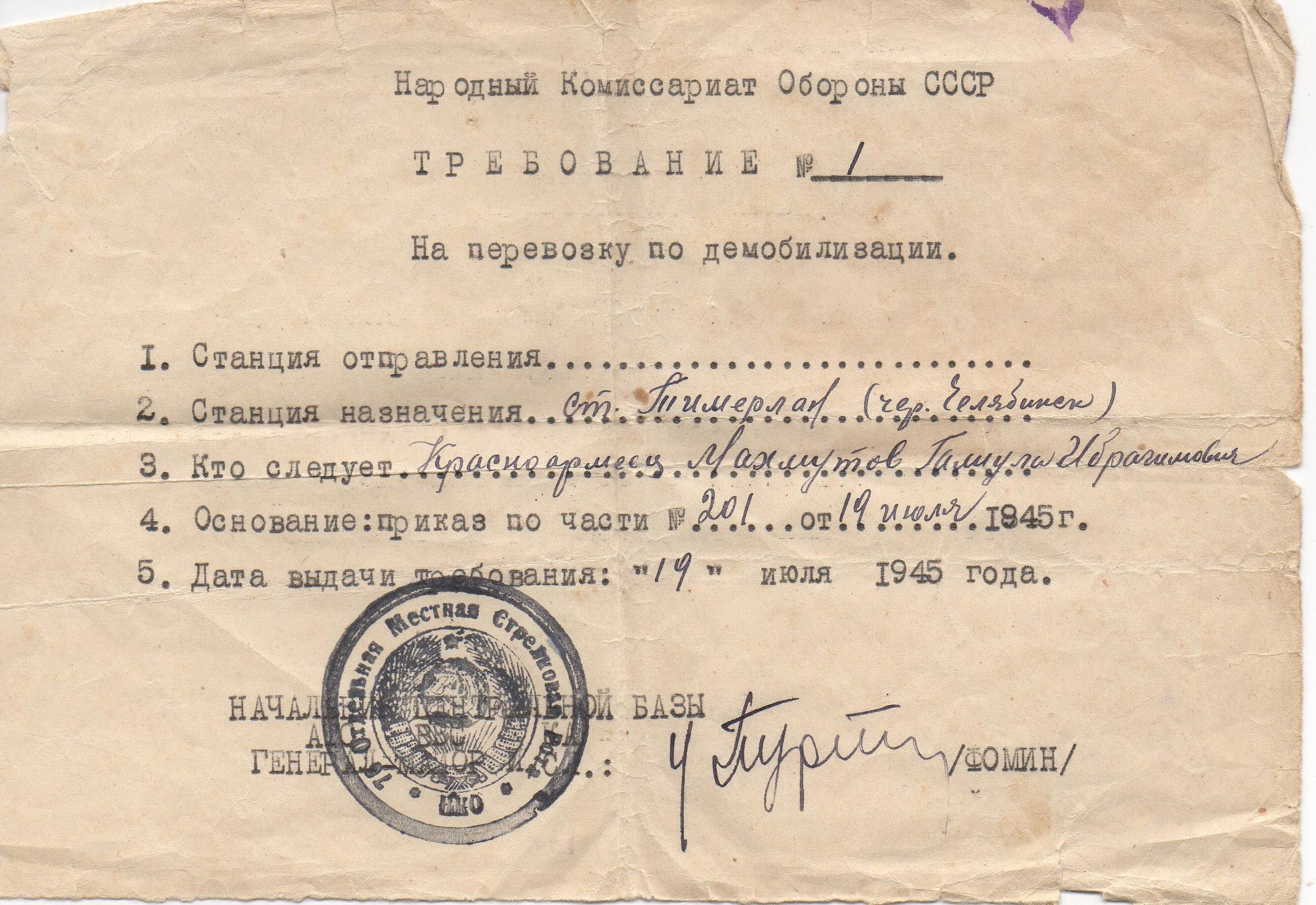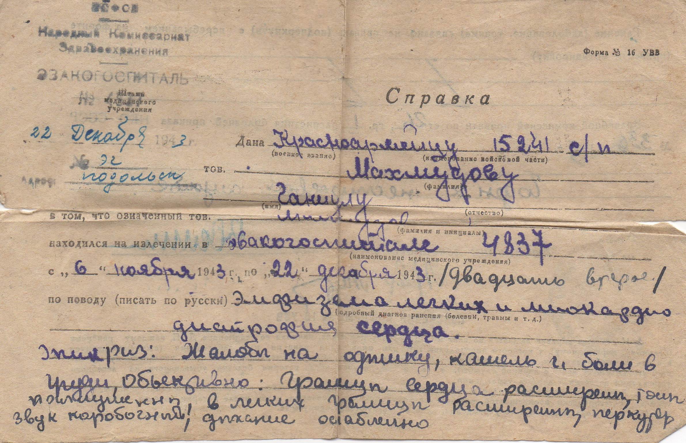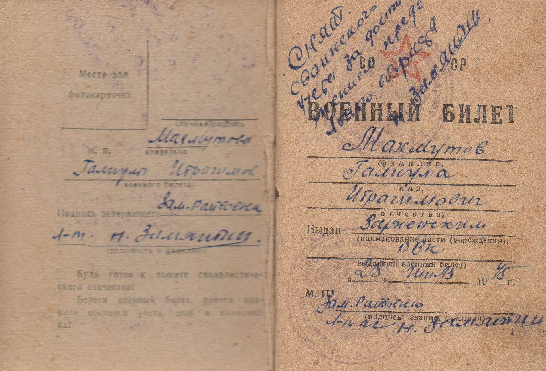 Галиулла Ибрагимович ушел на фронт19 июля 1941 года в возрасте 49 лет.С мая 1943 года по октябрь 1943 года-стрелок 24 запасного стрелкового полка.,с октября 1943 года по июнь 1945 года -стрелок рядовой 76 отд.медн.стрелковой роты.(Из за болезни лечился в госпитале №4837 с 6 ноября по 22 декабря 1943 года.)Демобилизован 23 июня 1945 года.