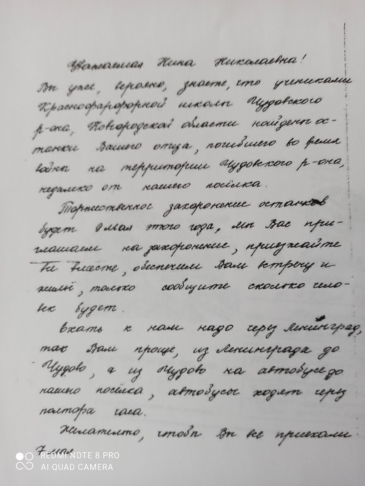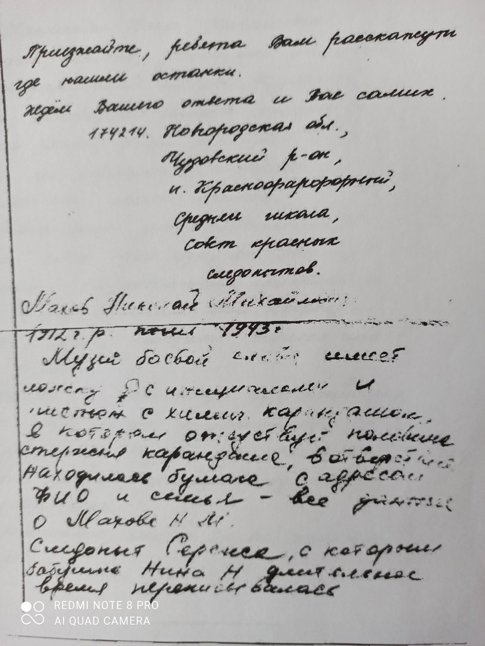 Махов Николай Михайлович, 1912 г. р., Вологодская обл. Петриневский р-н Дмитриевский с/с. д. Афонино, был призван в Красную армию 12.10.1941г. Петриневским РВК Вологодской обл. Семья: жена Махова Анна Кирилловна, дети Зоя Николаевна, Юлия Николаевна, Нина Николаевна. Официально: пропал без вести 03.1942г. (источник: ЦАМО, фонд 58, опись 18004, дело 2358, донесение 81371, лист 278, дополнение - том Череповецкий р-н. Запись 3415/2ч(бв). С 1974 по 1976 гг. на территории Новгородской обл. Чудовского р-на посёлка городского типа Краснофарфорный в районе бывшего железнодорожного моста между р. Любунька и р. Волхов учениками Краснофарфорной МБОУ «ООШ» (красными следопытами) Бариновым Сергеем, Крайнёвым Николаем и др. были найдены останки 43 бойцов Красной армии, павшими смертью храбрых в жесточайшем бою. Предположительно это была Любанская наступательная операция (07.01.1942-30.04.1942, Битва за Волхов), но возможно и наступательная операция "Искра" (12.01.1943-30.01.1943). Трёх из найденных по смертным медальонам опознали, в их числе Махов Николай Михайлович. Был найден пистон, в котором отсутствовала половина стержня химического карандаша, в отверстии обнаружили бумагу с адресом, ФИО и указанием семьи. Так же найдена ложка с его инициалами, но по запросу в музей в апреле 2024 года ни ложка ни медальон в музее не значатся. В 1975 году в центре посёлка установлен памятник над братской могилой. 9 мая1976 года провели торжественное захоронение останков Махова Н.М., на которое смогла приехать его дочь, Берникович Нина Николаевна.
