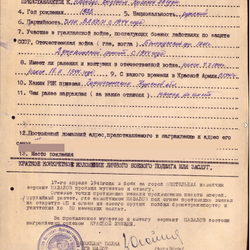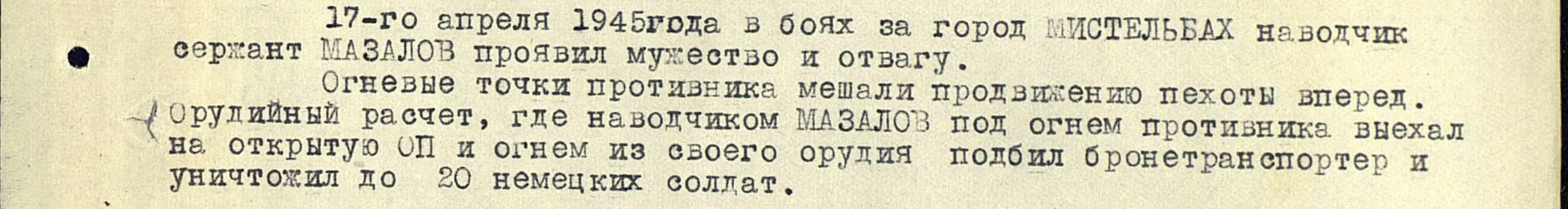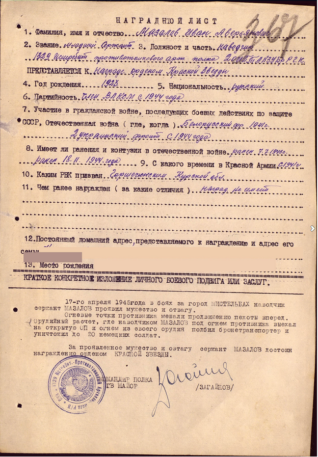 Мой прадедушка Мазалов Иван Аверьянович попал на фронт в возрасте 18 лет. Служил в артиллерийском полку в звании ефрейтор. Был командиров противотанкового орудия. Участвовал в боях на Курской Дуге, освобождал г.Старый Оскол и посёлок Горшечное. В бою под Прохоровкой получил ранение,после чего был направлен в госпиталь г.Старый Оскол. После выписки из госпиталя воевал на Южном фронте,участвовал в Корсунь-Шевченковской операции. Воевал: на Украине,в Молдавии,в Польше и окончил войну в городе Прага. Имеет много боевых медалей,орден Красной звезды и орден Красного знамени.