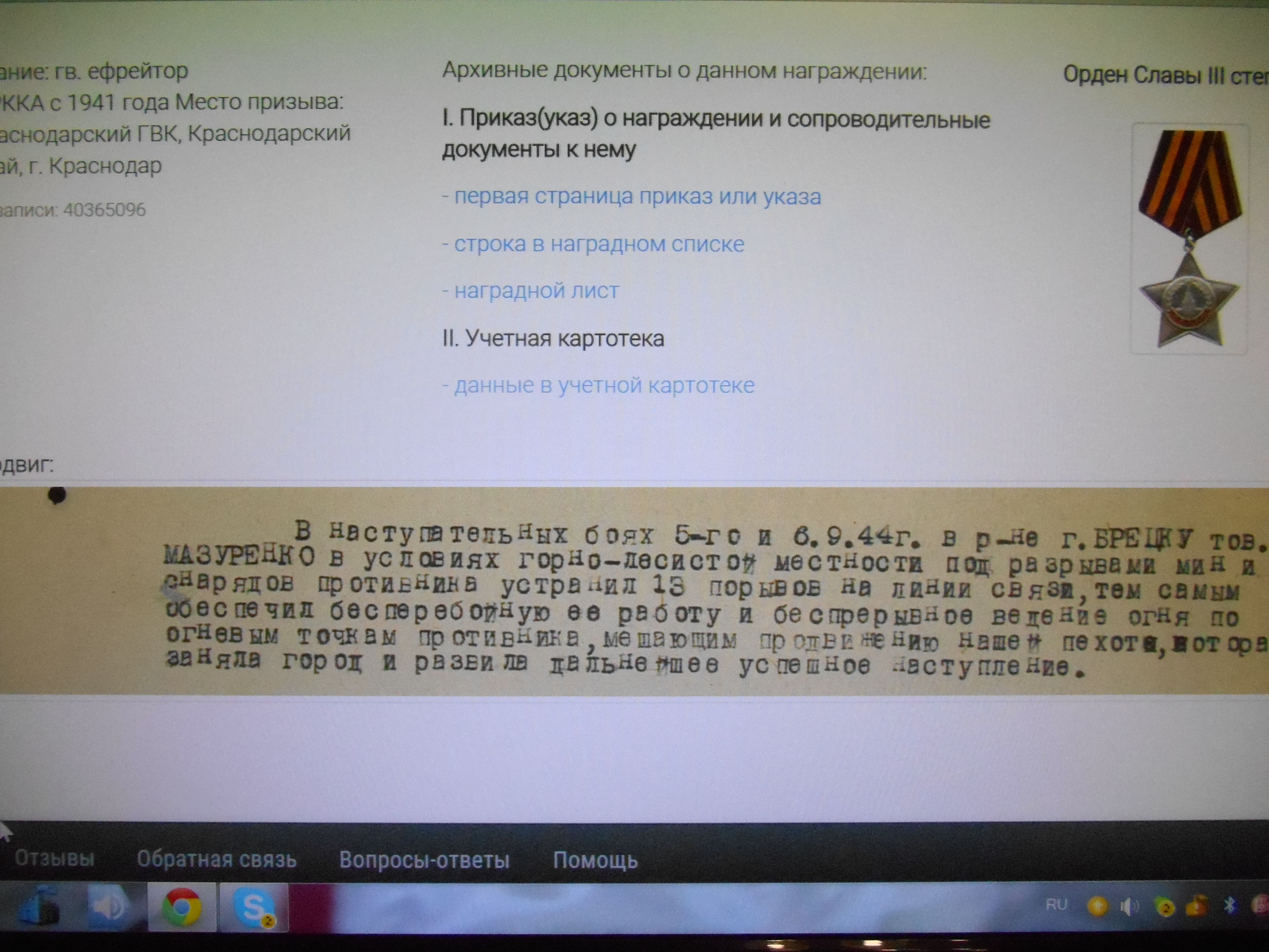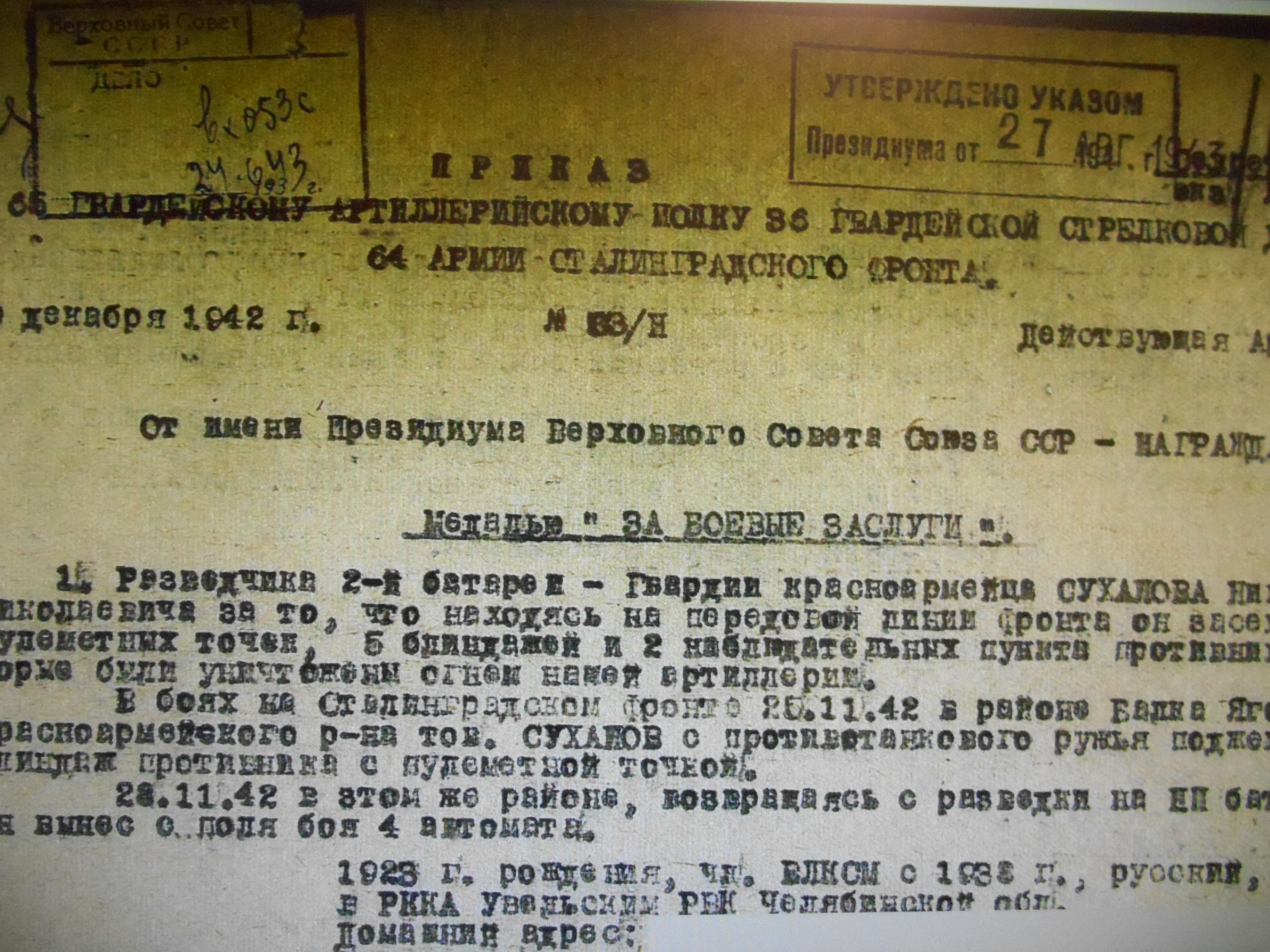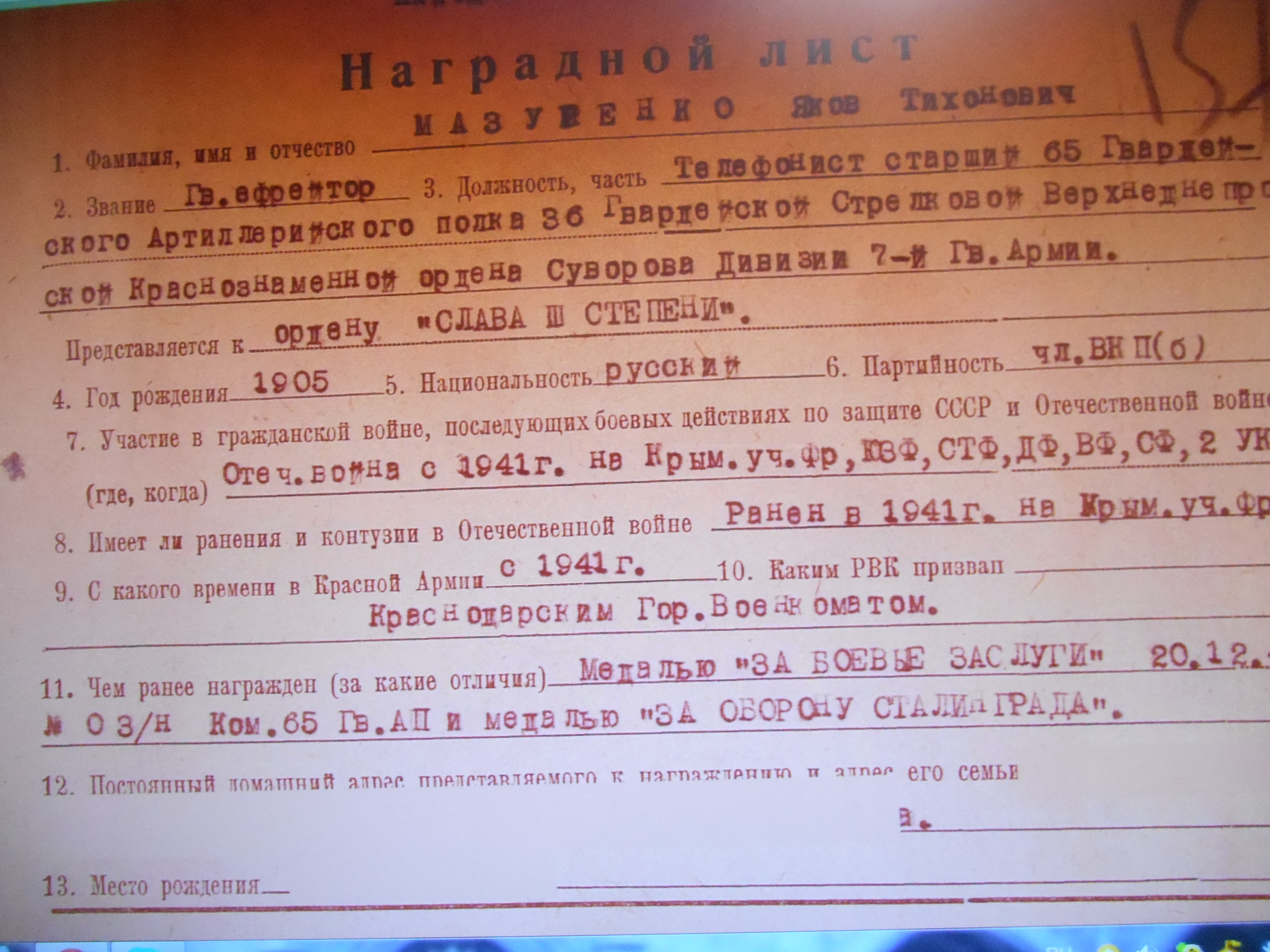 Призван в действующую армию в 1941 году. Воевал до Победы. Боевой путь закончил на озере Балатон в Венгрии. Имел ранения. Лечился в госпиталях и возвращался в строй. Мама ездила навещать его в госпиталь в Сочи. Вступил в КПСС в 1943 году. Был очень порядочным человеком, семьянином. Работал до 67 лет. Воспитал прекрасных сыновей и дочь. Я дочь, мне уже 67 лет. Работаю врачом. Очень благодарна отцу и матери за то, что учили меня. Сыновья, к сожалению умерли в 19 и 36 лет.