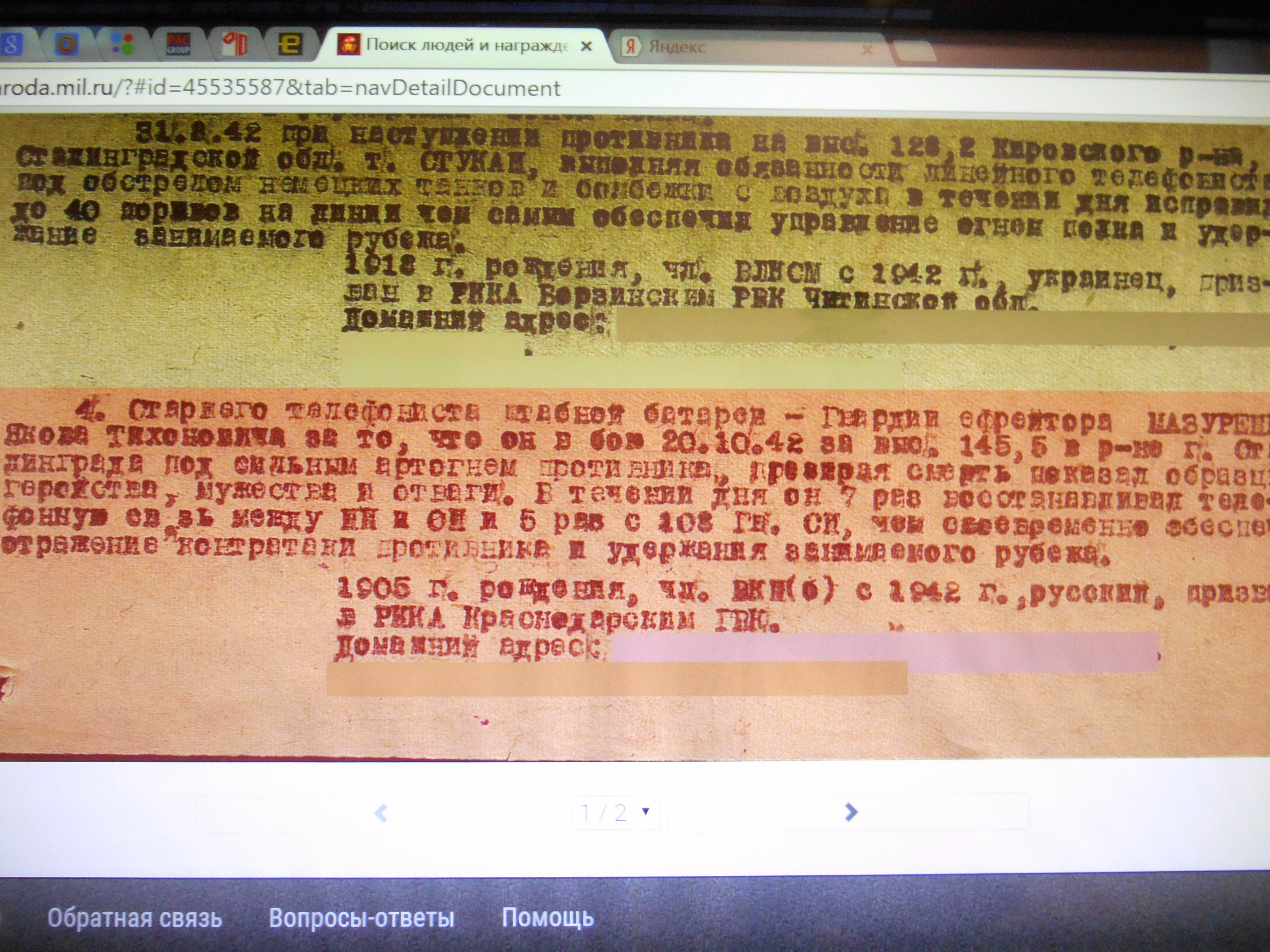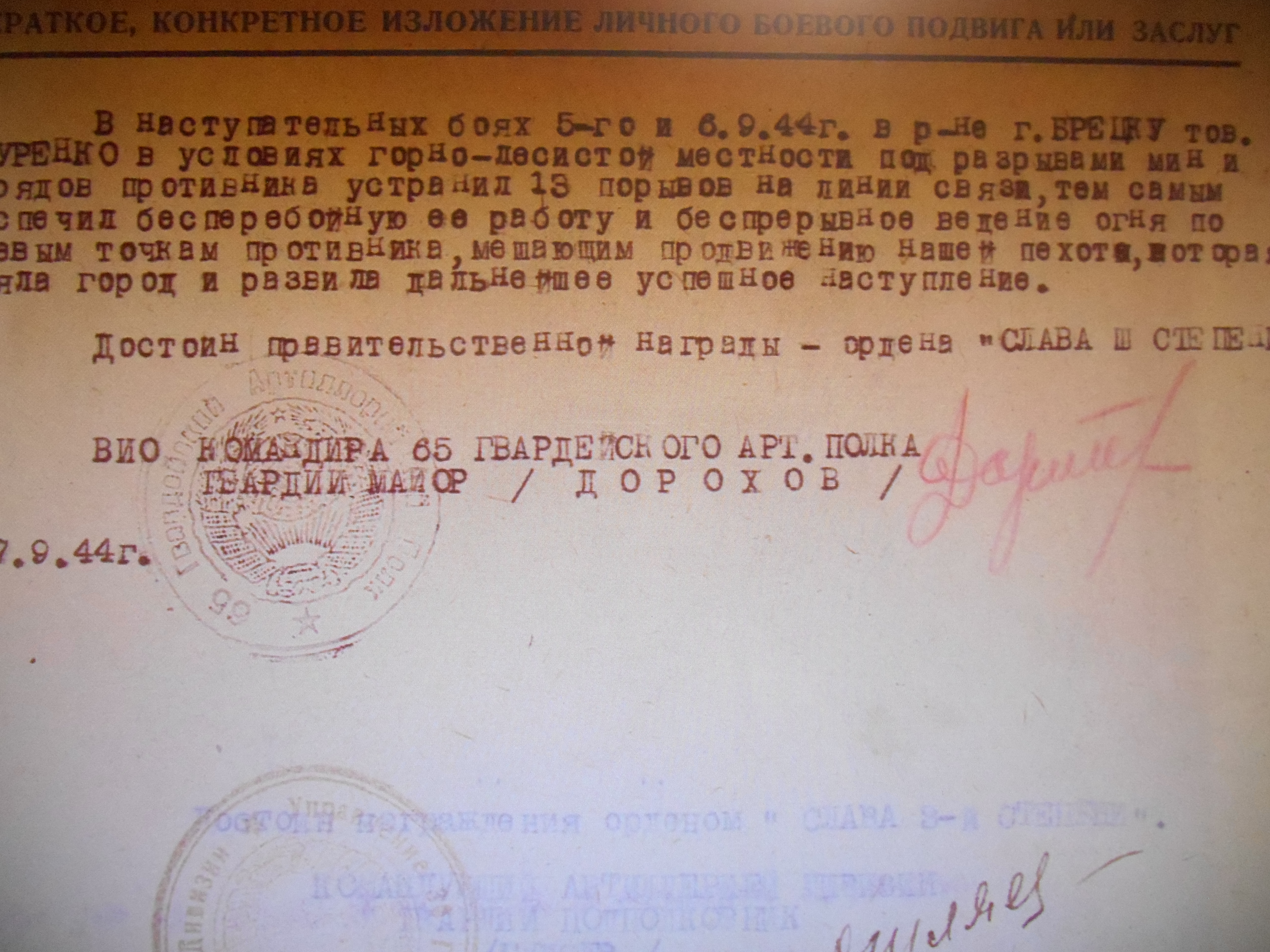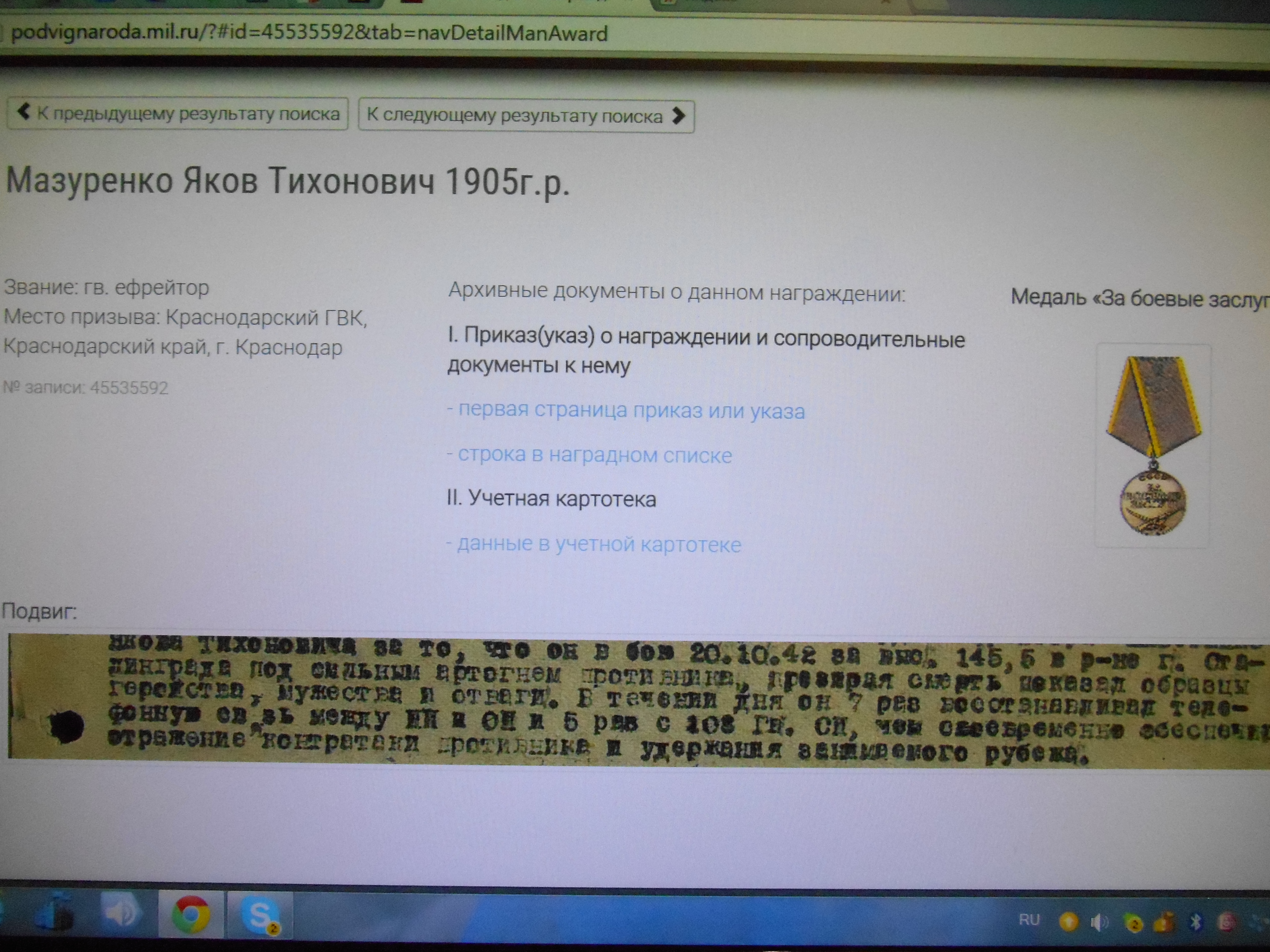 Призван в действующую армию в 1941 году. Воевал до Победы. Боевой путь закончил на озере Балатон в Венгрии. Имел ранения. Лечился в госпиталях и возвращался в строй. Мама ездила навещать его в госпиталь в Сочи. Вступил в КПСС в 1943 году. Был очень порядочным человеком, семьянином. Работал до 67 лет. Воспитал прекрасных сыновей и дочь. Я дочь, мне уже 67 лет. Работаю врачом. Очень благодарна отцу и матери за то, что учили меня. Сыновья, к сожалению умерли в 19 и 36 лет.