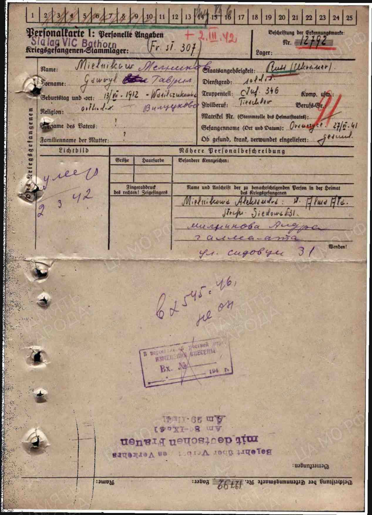 Родился 13 июля 1912 года в с. Васильчуково Ключевского района Славгородского уезда. Гавриил Акимович 24 марта 1941 года Ленинским РВК г. Алма-Аты был призван на службу в РККА. Службу проходил в 346-й отдельном строительном батальоне (столяр) 62-го укрепленного района 4 армии Западного особого военного округа в районе г. Бреста. 27 июня 1941 года в районе г. Ораны попал в плен. До 25 июля находился в лагере Шталаг 307 в районе г. Бяла Подляска (Польша). Затем был перемещен в лагерное объединение «Шталаг VI С» (Германия, Нижняя Саксония) с начала в Витмаршен, затем в лагерь п. Батхорн. 21 января 1942 года перемещен в лагерь смертников который находился в п. Далум. Умер 02 марта 1942 года. Последнее письмо от мужа его жена Александра Андреевна получила перед самым началом войны из госпиталя, который находился в г. Бресте. Согласно справке военкомата от 30 октября 1946 года Гавриил Акимович пропал без вести в сентябре 1941 года. Других сообщений от мужа Александра Андреевна больше не получала.