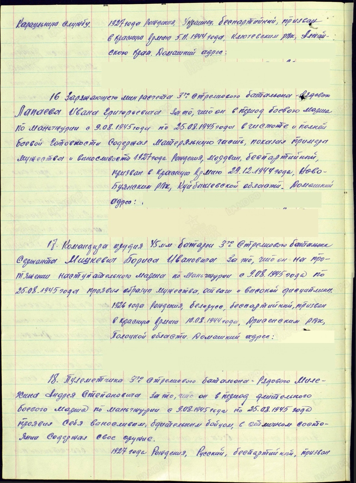 Был призван в ряды Красной армии в 1944 году Салтыковским РВК Пензенской области. На войне был пулеметчиком 3-го стрелкового батальона, 950 стрелкового ордена Суворова полка, 262 стрелковой Демидовской Краснознаменной и ордена Суворова дивизии. Принимал участие в Советско-японской войне. Имеет боевые награды. В 1945 году за отвагу в боях в Маньчжурии полковым приказом № 028 был награжден медалью «За Отвагу».