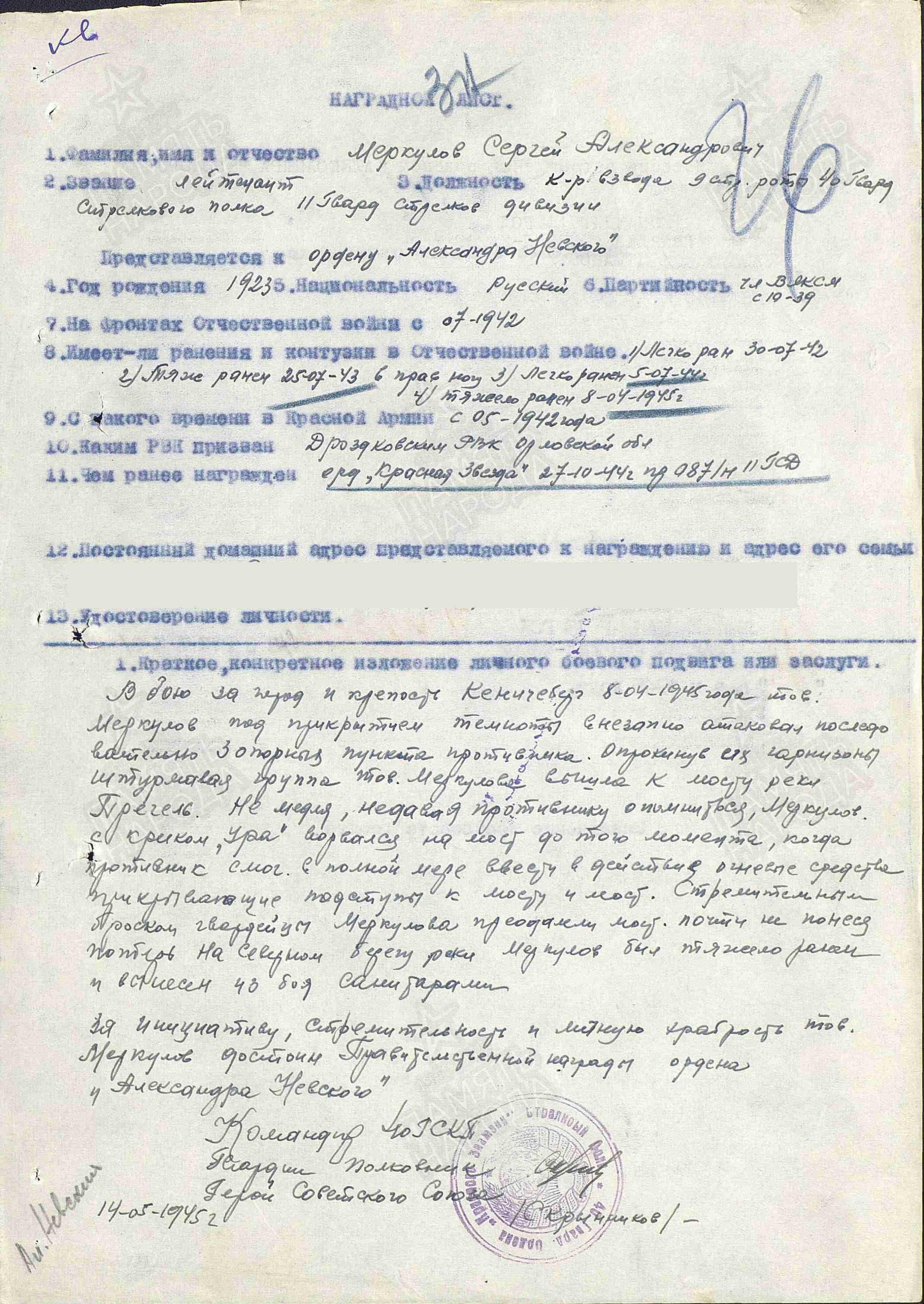 «… В бою за город и крепость Кёнигсберг 08 апреля 1945 года прадедушка под прикрытием темноты внезапно атаковал последовательно три опорных пункта противника. Опрокинув их гарнизоны, его штурмовая группа вышла к мосту реки Прегель. Немедля, не давая противнику опомниться, прадед с криком: «Ура!» ворвался на мост до того момента, когда противник смог в полной мере ввести в действие огневые средства, прикрывающие подступы к мосту и мост. Лейтенант Меркулов с двенадцатью бойцами овладел двумя дзотами, которые построили немцы недалеко от моста, на северном берегу реки Прегель. Основная задача перед оборонявшимися в них фашистами заключалась в том, чтобы держать мост под обстрелом и препятствовать нашим бойцам на случай переправы по мосту.
