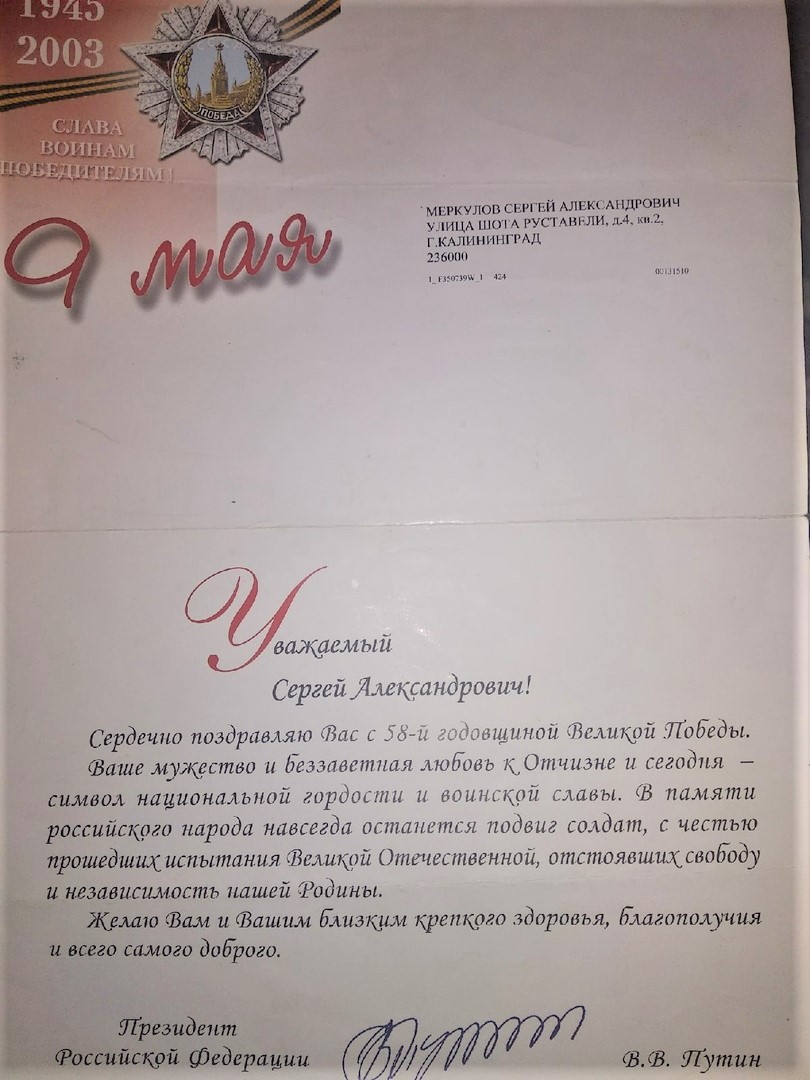 14.01.2004 г. – неизвестного героя Великой Отечественной войны, ветерана становления Калининградской области, Меркулова Сергея Александровича, не стало. Не один раз в год не только мы, родственники, а и юные патриоты, несут цветы мужественному, трудолюбивому и очень доброму человеку на могилу, которая находится в посёлке Космодемьянского».