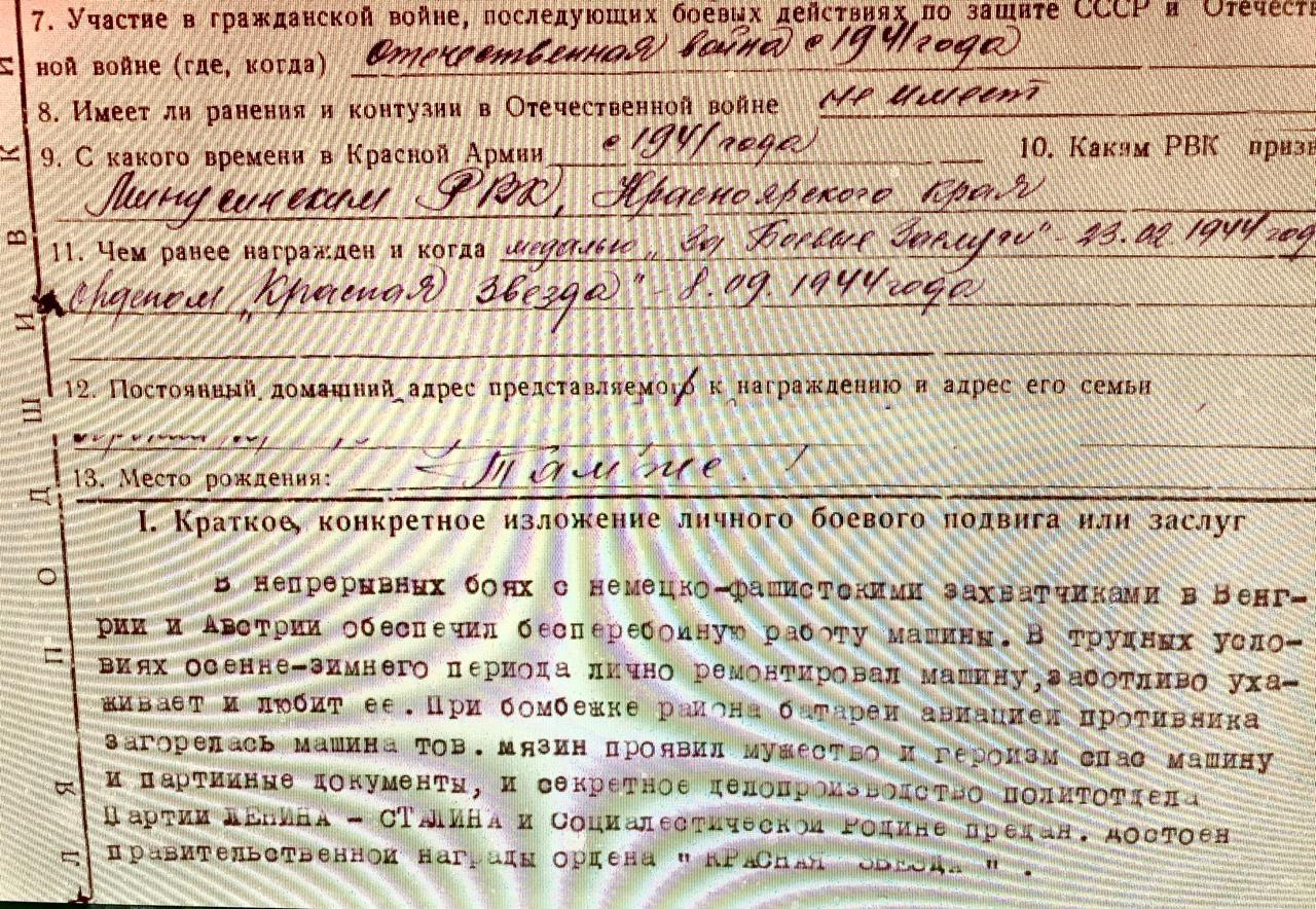 Вехи фронтового пути Ивана Матвеевича: - 10.09.1942 - Сталинградский фронт; - 13.02.1943 - Юго-Западный фронт; - 17.11. 1943 - Украинский фронт; - 18.02.1944 - Украинский фронт; - 06. 03. 1944 - Карельский фронт; - 12. 02.1944 - 08.10.1944 -Украинский Фронт; - Южная группа - июнь 1945 год. Сильный и умелый шофёр, призванный на фронт из села Малая Минуса Красноярского края, чудом остался жив после контузии под Сталинградом. Земляк-сибиряк Андрей Кошляк откопал его, засыпанного землёй, на поле боя. Однажды на своей полуторке Иван Мязин спас 17 раненых бойцов. Его отваге удивились даже фашисты, чудом не расстрелявшие их из ближайшего окопа. Самоотверженный солдат, он сберёг немало жизней, в составе 4-го Украинского фронта освобождая Молдавию, Болгарию, Венгрию, Югославию. Иван Матвеевич переплыл реку Северный Донец с огромной катушкой кабеля для связи и установил связь с командованием. За это его представили к Ордену Красной Звезды.