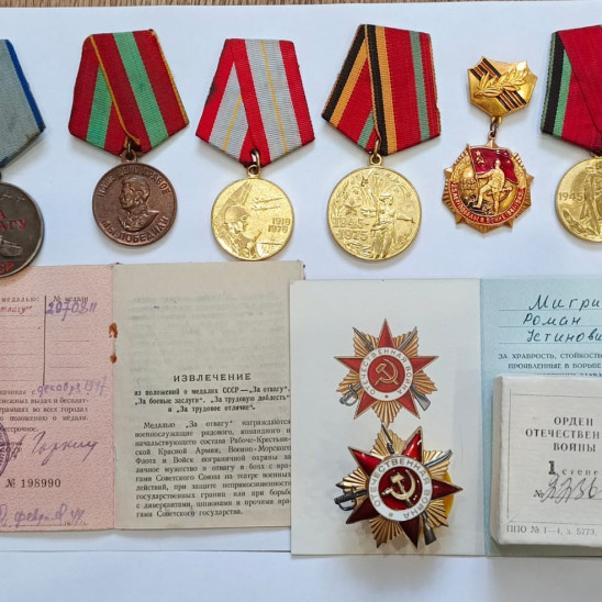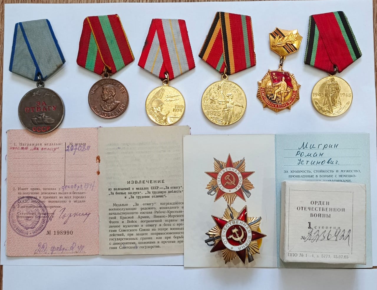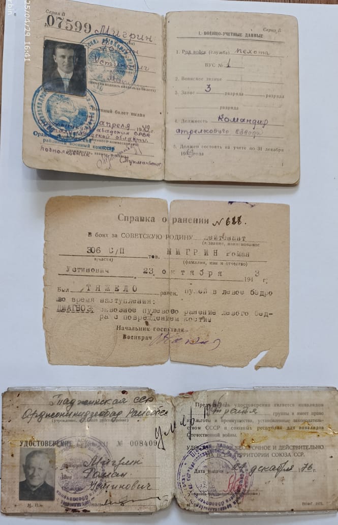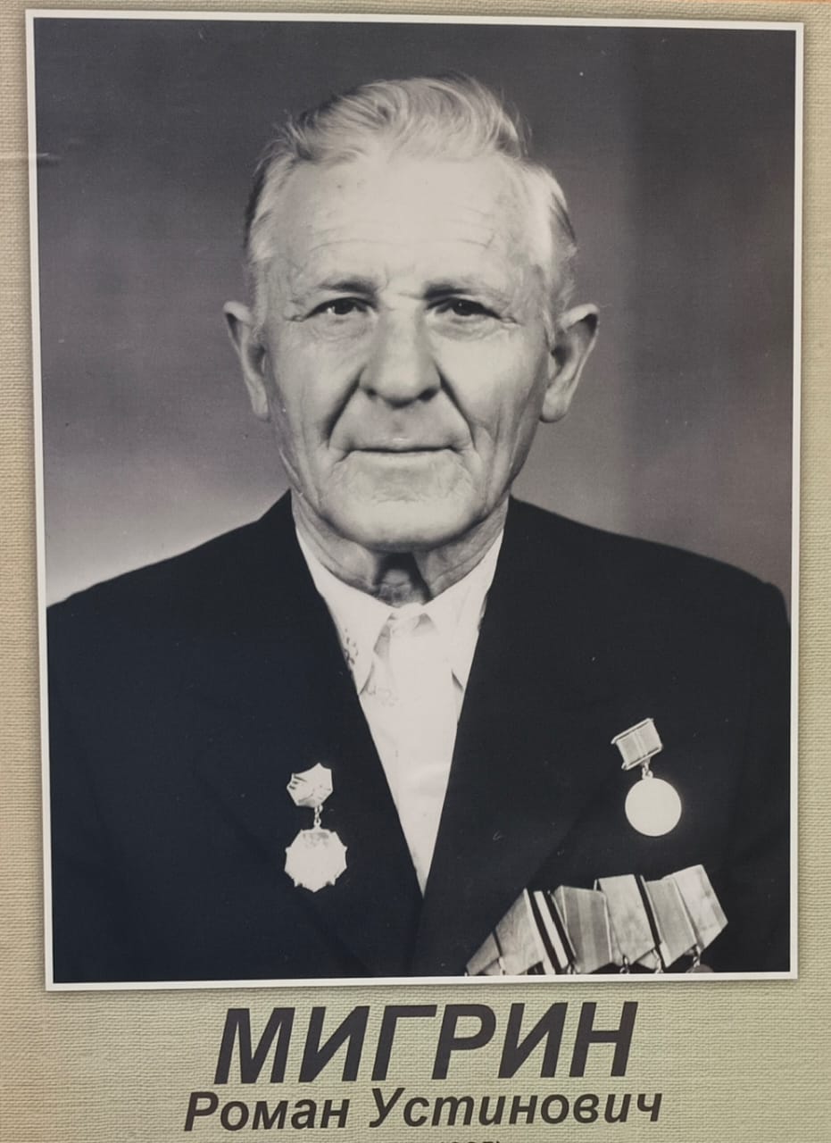 Мой дед родился 29 января 1914 года в селе Копылов Макаровского района Киевской области. В ноябре 1937 года его призвали на прохождение службы. Прадедушка был курсантом, потом ему присвоили должность помощника командира стрелкового взвода, старшина. Дедушка прослужил 3 года в приморском крае. Когда началась война с Германией мой дед Роман Устинович закончил ускоренные курсы Орловского военно-пехотного училища. Он учился 6 месяцов и в мае 1942 года по июнь 1943 снова призван на воинскую службу в качестве командира стрелкового взвода. Дедушка обучал стрелковому делу молодых бойцов. Мой прадед ушёл на фронт воевать с Германией с июня 1943 года. Он был очень смелым и отважным командиром стрелкового взвода(№877 стрелкового, 57 Армии Степного фронта) Зловещая вражеская пуля ранила моего прадедушку под городом Верхне-Днепровск 23 октября 1944 года. Ранение было очень тяжёлым. Пуля прошла левое бедро и повредила кость. Дед Роман лежал на излечении в военном госпитале с 23 октября 1944 года по 31 июля 1944 года, а затем его уволили в запас в звании лейтенанта. Я уважаю, люблю и горжусь своим прадедушкой Мигриным Романом Устиновичем за то , что он помог Советскому Союзу в победе над фашистской Германией.