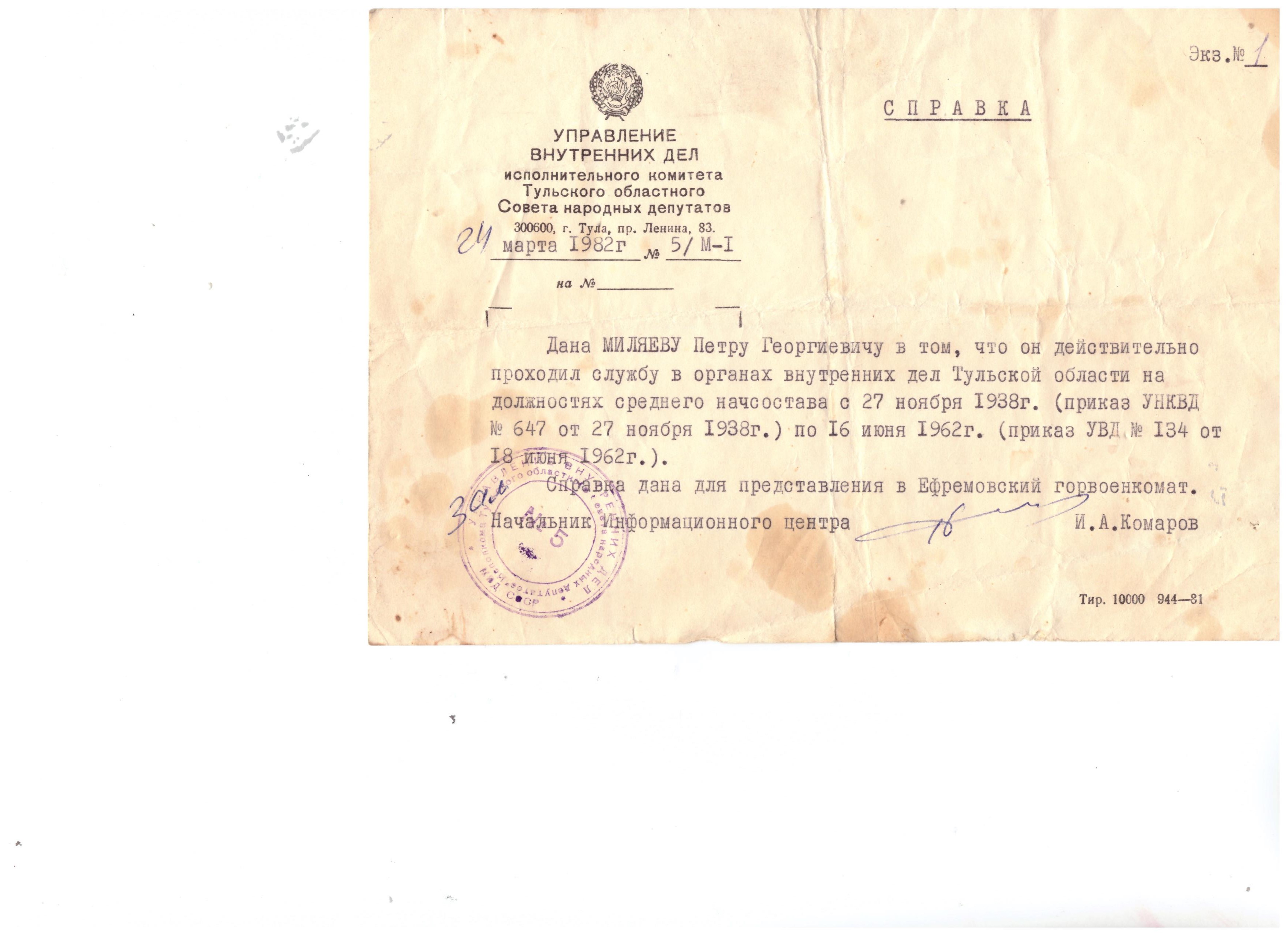 Я помню, я горжусь. Накануне 80-летия Великой Победы, мне захотелось рассказать семейную историю… Наверно, все героические подвиги уже описаны и воспеты. Годы унесли очевидцев тех грозных событий. На торжественном собрании, посвященном 23 февраля 2025 года, Сергей Григорьевич Балтабаев, депутат Тульской областной Думы, объявил о том, что на нашей ефремовской земле осталось всего три участника войны. Возвращаюсь в свои школьные годы…каждый раз, накануне 9 мая, к нам приходили участники войны, вспоминали, говорили о том тяжелом времени. Кто-то из них сказал: «Наступит такой день, когда нас не станет, и только вы, сможете рассказать последующим поколениям правду про нас». Теперь я понимаю, что «этот день» близок. Сегодня, думаю, можно вернуться к семейной истории. Мой дед, Миляев Петр Егорович, родился в 12 июля 1912 года в селе Киреевка Дедиловского (ныне Киреевского района) Тульской области в крестьянской семье. С 27 ноября 1938 года по 16 июня 1962 года проходил службу в органах внутренних дел Тульской области на должностях среднего начсостава, так написано в архивной справке. С 1948 года по службе переехал с семьей в Ефремовский район, работал инспектором пожарной охраны. По документам партийного архива Тульского обкома КПСС установлено, что мой дед, Миляев Петр Егорович значился в списке товарищей, принимавших участие в обороне городов Тулы и Москвы от немецко-фашистских захватчиков в 1941 году. А вот сведений о его пребывании в истребительном батальоне Дедиловского района в 1941 году не сохранилось. Он несколько раз писал в военные и партийные архивы, но так не смог подтвердить этот факт. Ему хотелось получить удостоверение участника войны, но в 1978-79 году этот документ получили только те, кто числился в частях регулярной армии. Партизаны, ополченцы, участники подполья, бойцы истребительных батальонов не вошли в этот список. Историческая справедливость восторжествовала в 1999 году, года многие уже ушли из жизни. На просьбы рассказать о войне, дед отмалчивался, говорил: «Ничего я особенного не делал, только человека одного спас». Был счастлив, когда получил медали «За оборону Москвы», «Тридцать лет Победы». В марте 1965 года, спасенный дедом Клименко Иван Кузьмич, приехал из Новосибирска в Ефремов, чтобы встретиться и поблагодарить Петра Егоровича. Подарил фотографию своей семьи, на которой он с сыном Владимиром и женой Прасковьей Антоновной. На обратной стороне надпись – на вечную память Миляеву Петру Егоровичу, спасшему мою жизнь 4 ноября 1941 года после боя с немцами близь села в Тульской области Дедиловского района. Рискуя жизнью, дед вынес раненого бойца и спрятал его в доме своей матери. Вскоре наша армия освободила Дедиловский район и спасенный солдат отправился в госпиталь. После войны, несколько лет Иван Кузьмич Клименко разыскивал деда, и через двадцать лет после Победы они встретились. Миляев Петр Егорович вырастил троих детей, шестерых внуков, работал в котельной до 70 лет, трагическая случайность оборвала его жизнь в 1983 году. На его памятнике – георгиевская ленточка и фотография с медалями. Он ничего особенного на войне не делал… только спас человека.
