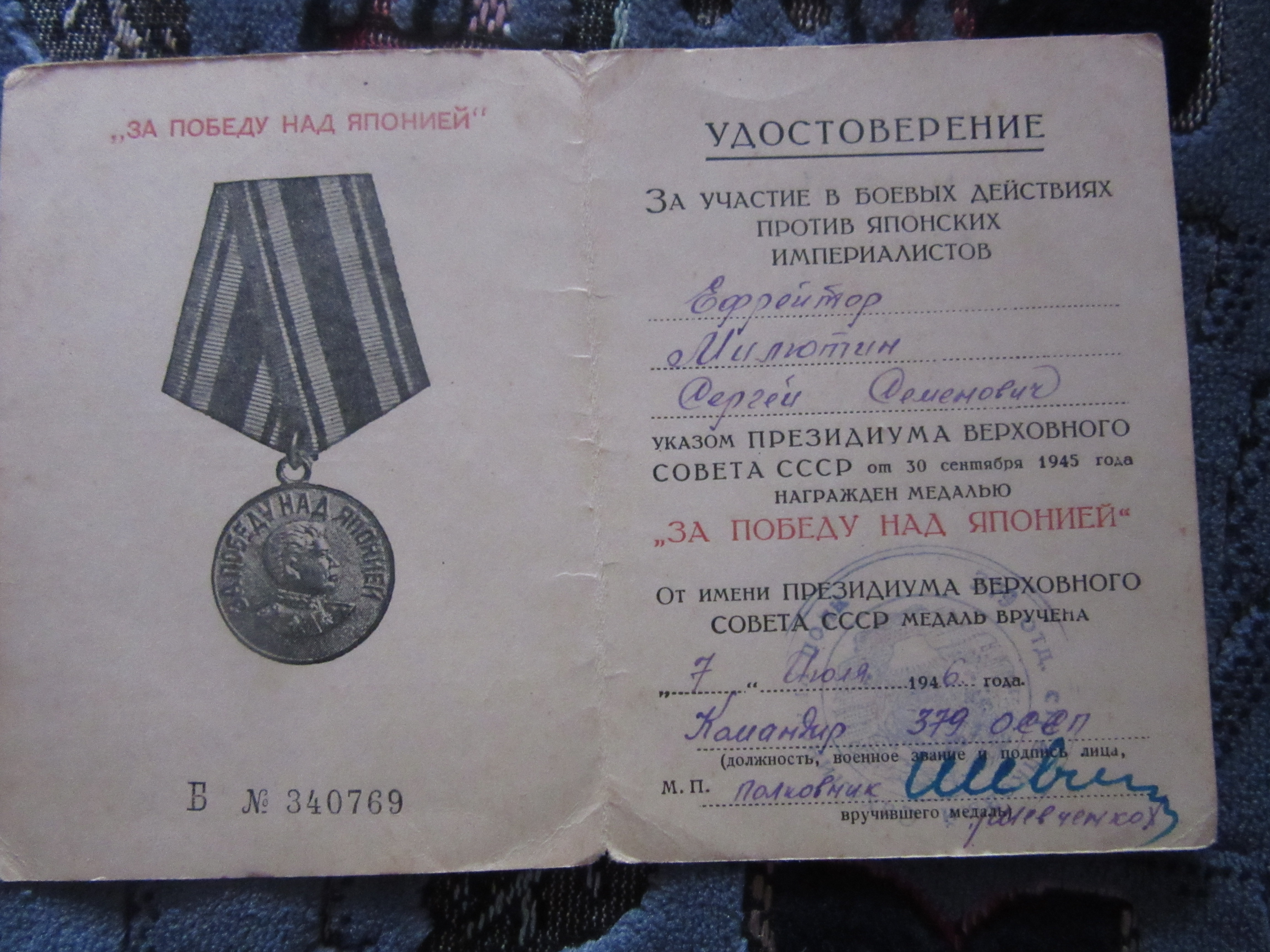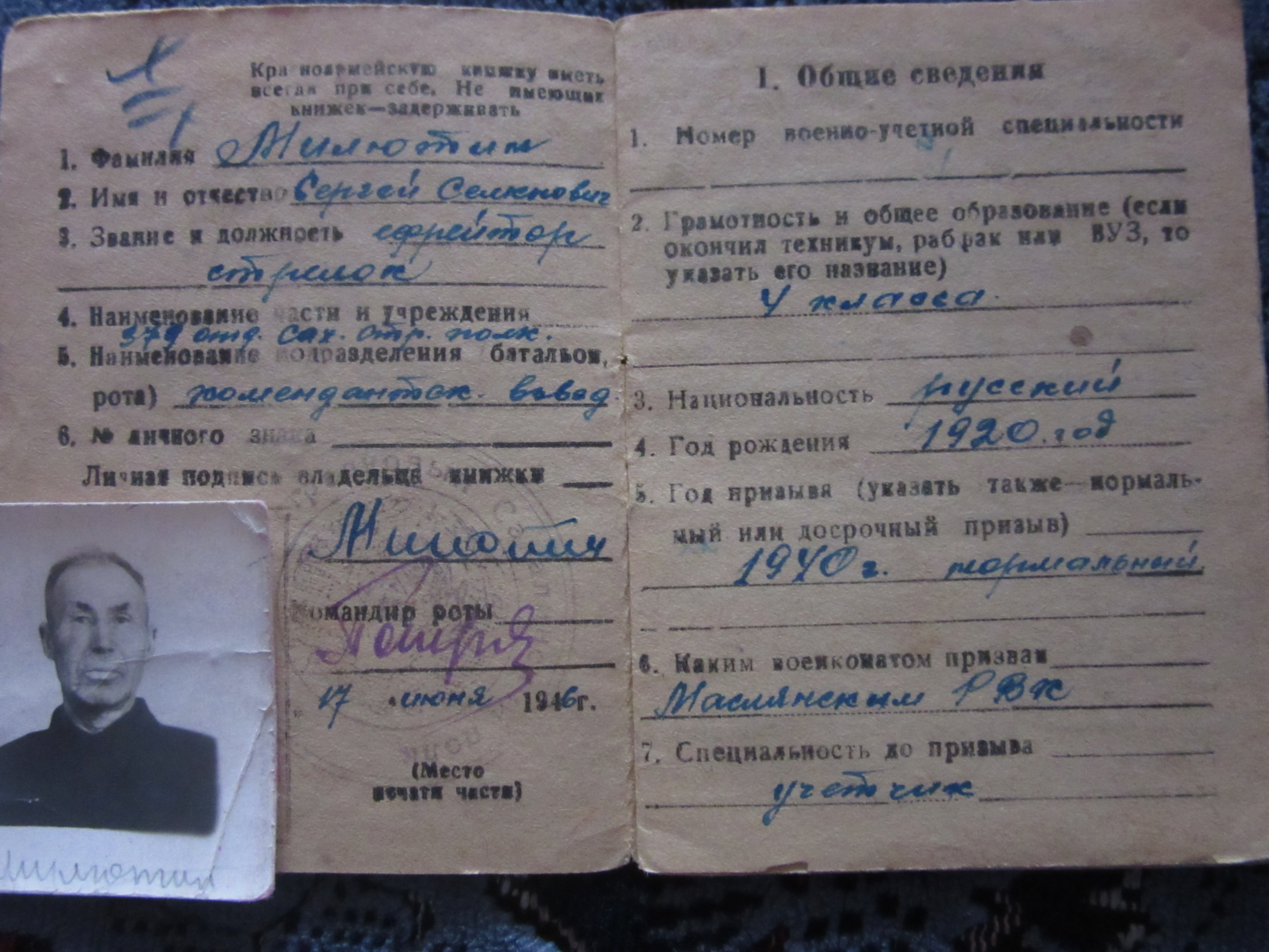 Милютин Сергей Семёнович Дата рождения: 15 августа 1920 года Место рождения: Россия, Тюменская область, Маслянский район Военная служба: В 1940 году был призван в армию. Великую Отечественную войну встретил на острове Сахалин. Во время войны служил в звании ефрейтор, исполняя обязанности стрелка. Награды: Медаль «За победу над Японией» Медаль «За освоение целинных земель» Орден «Знак Почёта» Орден «Красное Знамя» Демобилизация: 20 марта 1946 года После войны: Вместе с супругой переехал в Казахстан для участия в освоении целинных земель. Работал председателем совхоза в селе Мичурино, Северо-Казахстанская область. Под его руководством совхоз достиг значительных успехов, которые были представлены на ВДНХ в Москве. Семья и личная жизнь: Оставил после себя троих детей, четырёх внуков и троих правнуков. Год смерти: 1985