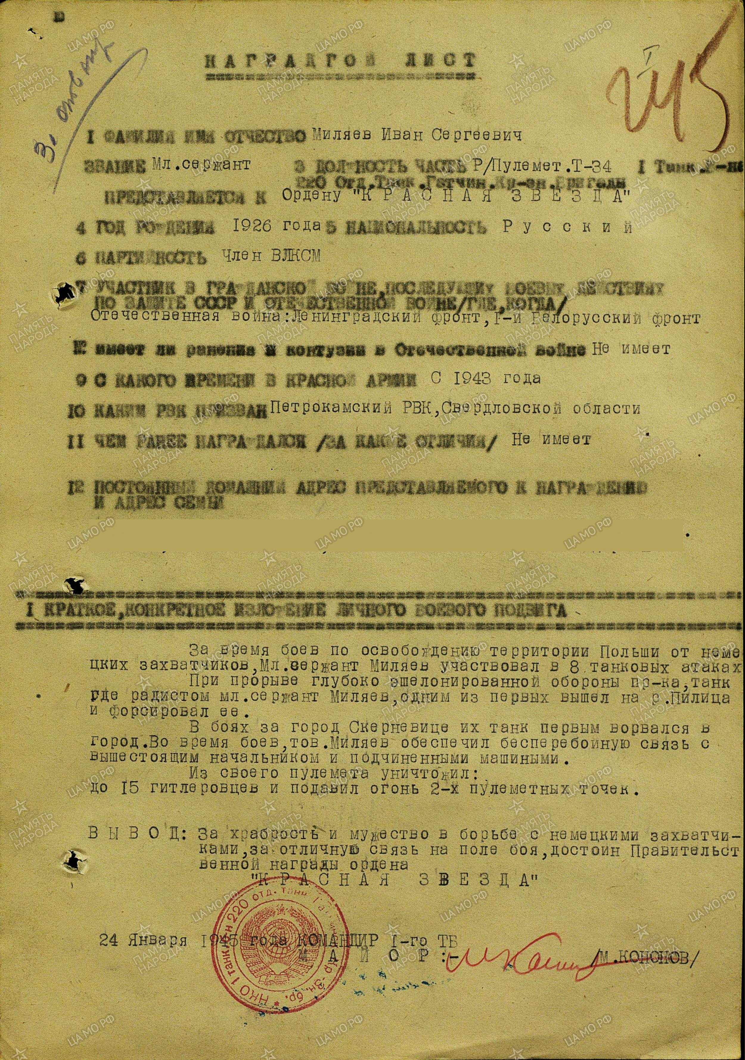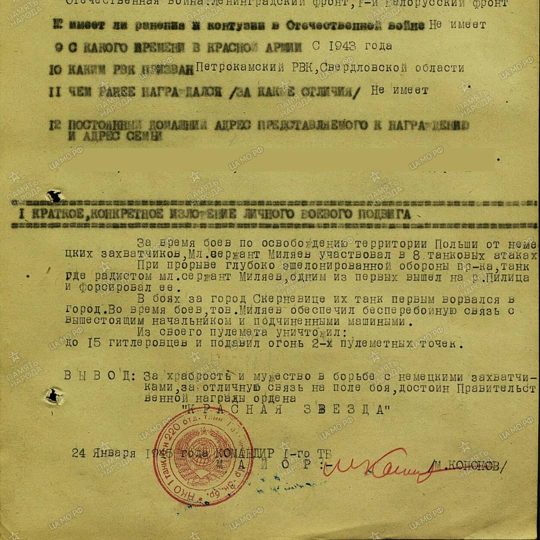 Мой дед Миляев Иван Сергеевич, 1926 г.р. уроженец с. Садового Александровского района Ставропольского края. Сержант 220 отдельной Танковой Гатчинской Краснознаменной бригады ордена Суворова. Война застала его в возрасте 16 лет, в г. Туапсе, куда он приехал поступать в ФЗУ при судоремонтном заводе. Во время бомбежки города все, кто выжил, прошли долгий путь пешком, через горы до Астрахани и дед и их числе. Там собирали группы людей, которых переправляли в Нижний Тагил на Уралвагонзавод, откуда он в 1943 году ушел на фронт. Его боевой путь начался с г. Кенигсберга радистом-пулеметчиком в составе 220 отдельной танковой бригады.Воевал под командованием маршала Советского Союза - В.И. Чуйкова и генерал-полковника Н.Э. Берзарина. В боях за Польшу участвовал в 8 танковых атаках. При прорыве глубоко эшелонированной обороны противника, его танк одним из первых вышел на р. Пилица и форсировал ее. В боях за г. Скерневице он первым ворвался в город, уничтожил из своего пулемета до 15 гитлеровцев и подавил огонь 2-х пулеметных точек, обеспечил бесперебойную связь с вышестоящим начальником и подчиненными машинами. За свои героические действия был награжден медалью "За отвагу", "За освобождение Варшавы" и званием младшего сержанта. Участвовал в Одерском наступлении, в составе 1-й танковой бригады 1-го Белорусского фронта. За период боевых действий батальона на р.Одер и при прорыве обороны противника, умело маневрируя, преодолел минное поле и пользуясь внезапностью подавил гусеницами 3 пулеметных точки вместе с расчетами. В числе первых, со стороны Трептов-парка "зашел" в г. Берлин, но в уличных боях за здание Гестапо, его машина была подбита вражеским фаустником, сам он получил контузию, но смог оказать первую помощь раненому командиру машины и башенному стрелку. Устранил повреждения и отвел танк в укрытие. За отвагу и мужество, проявленное в боях награжден орденом "Красной Звезды", медалью "За взятие Берлина" и званием сержанта. После войны еще 5 лет прослужил в Германии, после чего вернулся на домой, в родное Ставрополье.