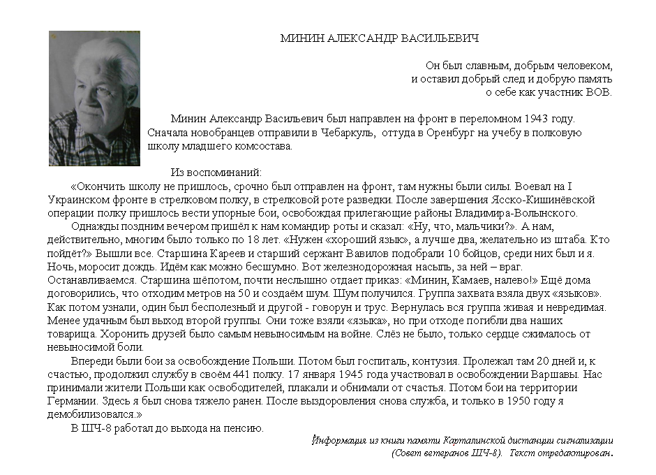 Мой дедушка МИНИН АЛЕКСАНДР ВАСИЛЬЕВИЧ родился 25 декабря 1926 года (но в свидетельстве о рождении записали дату рождения - 2 января 1926 года, т.е. по документам практически добавили 1 год жизни) в посёлке Черниговский Агаповского района Челябинской области, умер 26 ноября 1995 года в г. Карталы Челябинской области.