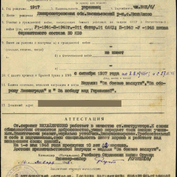 «... Сержант МИХАЙЛИЧЕНКО с первых дней войны был командирован орудия на 311 батарее 31-го Отд. Краснознаменного арт. дивизиона ИС КМОР КБФ. С августа 1941 г. по сентябрь 1943 г. орудие, которым командовал т. МИХАЙЛИЧЕНКО провело 52 боевых стрельбы по укреплениям и батареям немцев установленным на северном берегу Ф.3. и нарушающим наши морские коммуникации Кронштадт -острова. результате проведенных стрельб, орудие несколько раз подавляло батареи противника, вызывало несколько взрывов и пожаров, уничтожило большое количество техники, дотов и дзотов в так же уничтожило несколько десятков солдат противника. С сентября 1943 г. сержант МИХАЙЛИЧЕНКО работает в школе Сержантского состава БО КБФ в должности Старшины-комендоров. Является одним из лучших сержантов в школе, обладает хорошей методикой преподавания, много работает над повышением своих знаний, одновременно является парторгом роты. Курсанты воспитанные т. МЕХАЙЛИЧЕНКО на всех экзаменых показали высокие знания по специальности. ...»