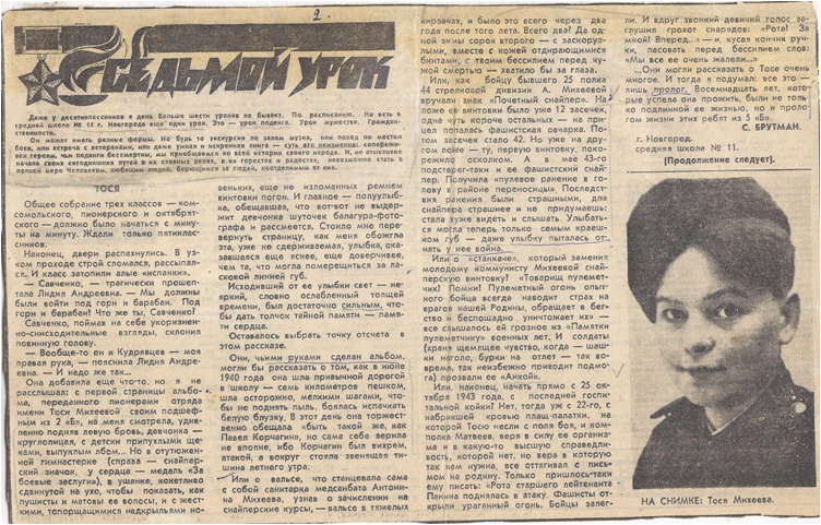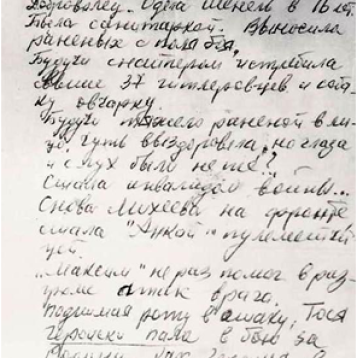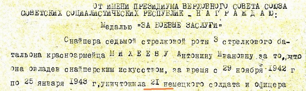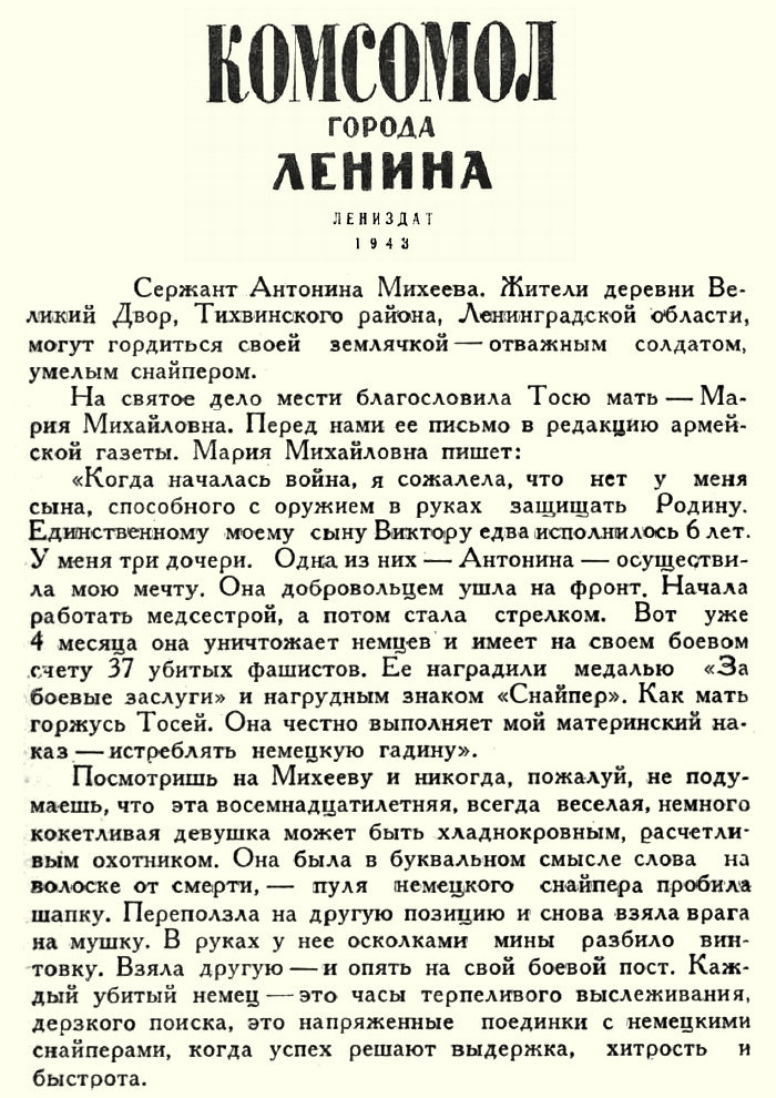 В конце 1942 года в красноармейской газете «В бой за Родину» появился снимок юной девушки с автоматом на груди.К началу 1943 года ей была вручена медаль «За боевые заслуги», а в снайперской книжке значилось 37 уничтоженных фашистов.