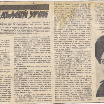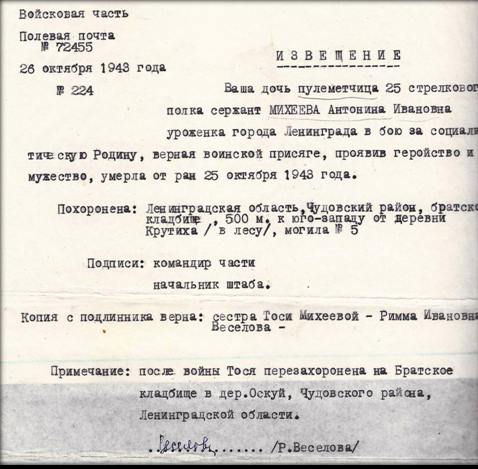 22 октября 1943 года в бою под Киришами сержант А. И. Михеева была тяжело ранена.