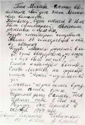 25 декабря 1942 года в адрес полевой почты (07638) матери пришло письмо командира части майора Адамяна. Он поздравил Марию Ивановну с совершеннолетием дочери, подчеркнул, что она «стала снайпером не так давно, но уже добилась больших успехов. За 21 день уничтожила 18 немцев.