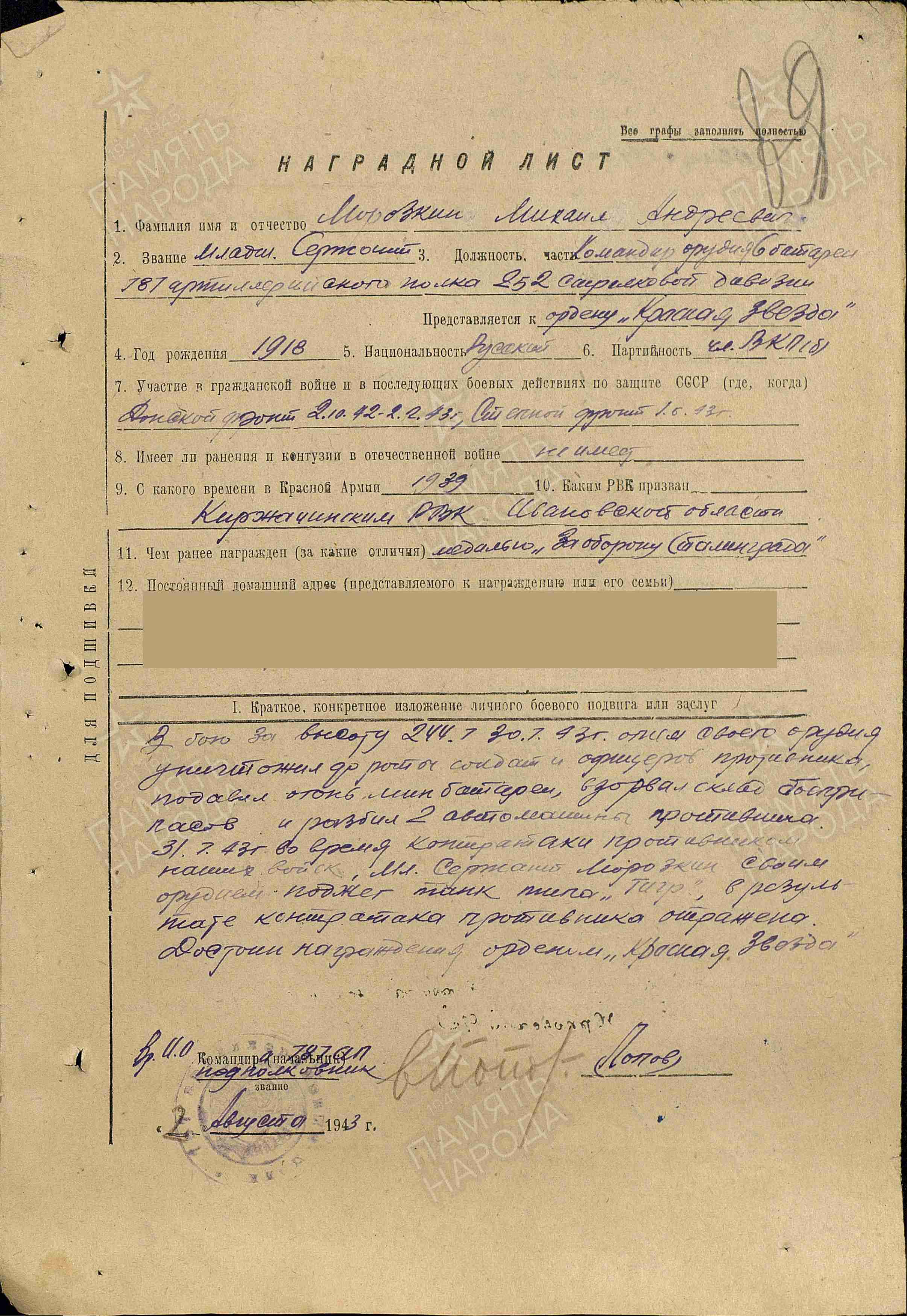 Морозкин Михаил Андреевич родился в 1918 году в деревне Афушино, Халинского сельсовета, Киржачского района, Ивановской (ныне Владимирской) области. Бал призван в ряды Красной Армии Киржачским РВК в 1939 году. Службу проходил в 28 оадн ХСБО ТОФ. После начала Великой Отечественной войны принимал участие в боевых действиях на Донском фронте (в периоды с 02.10.1942 по 02.02.1943 гг.), награжден медалью "За оборону Сталинграда". На Степном фронте воевал с 01.05.1943 года. Награжден Орденом Красной Звезды (Приказом от 1308.1943 г.) за совершенный подвиг: будучи командиром орудия (в звании младшего сержанта) 6 батареи 787 артиллерийского полка 252 стрелковой дивизии Михаил Андреевич в бою за высоту 244.7 - 30.07.1943 года огнем своего орудия уничтожил до роты солдат и офицеров противника, подавил огонь мин батареи, взорвал склад боеприпасов и разбил 2 автомашины противника. 31.07.1943 г. во время контратаки противником наших войск, он своим орудием поджег танк типа "Тигр" , в результате контратака противника отражена. Во время войны был ранен, лежал в госпитале. Жизнь Михаила Андреевича Морозкина оборвалась осенью 1946 года. Он ехал ночью на поезде из города Кольчугино (Владимирской области), где он проживал на тот момент. Поехал в Москву, к родной сестре, сообщить о том, что женится, купить подарки будущей супруге, что-то к свадьбе, которая должна была состояться на днях. По дороге в столицу его убили, ограбили и выбросили из поезда неподалеку от станции Жердево, где и было найдено его тело. Так и закончилась жизнь Михаила Андреевича...