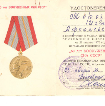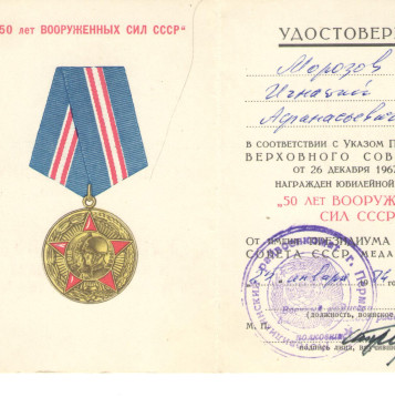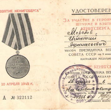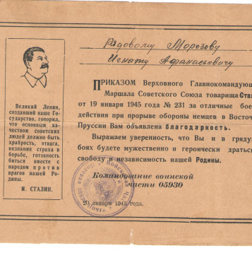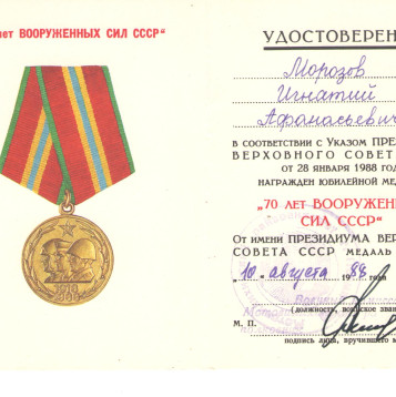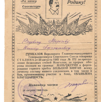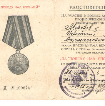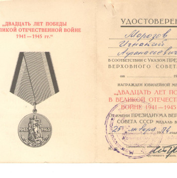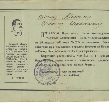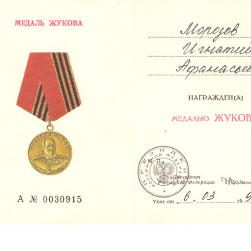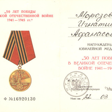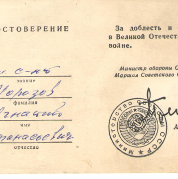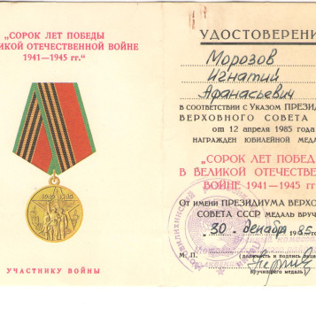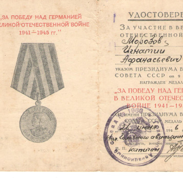 Морозов Игнатий Афанасьевич - орденоносец войны, рядовым сержантом прошел всю войну с первого и до последнего дня. Награжден множеством наград, среди которых: "За боевые действия при прорыве обороны немцев в Восточной Пруссии", "За отличные действия при овладении городом Восточной Пруссии- Топинау", "За разгром Кенигсбргской группы немецких войск и овладение крепостью и главным городом Кенигсберг", "За преодоление безводных степей Монголии, "за прорыв обороны Японии на границе Маньжурии и форсировании горного хребта Большой Хинган".