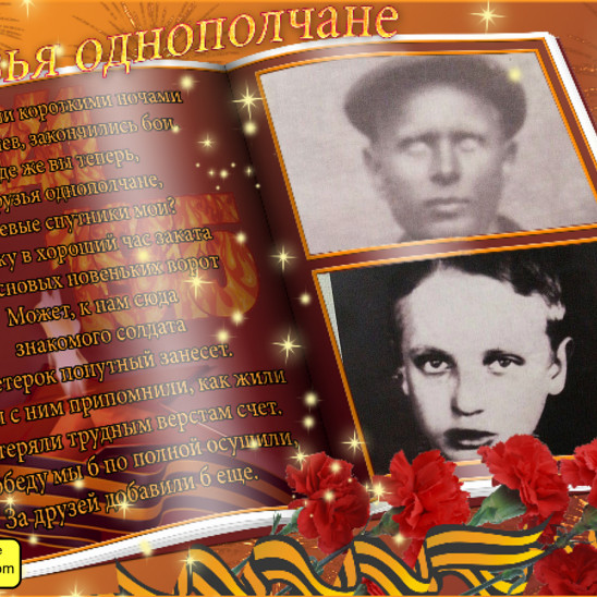МОРОЗОВ СТЕПАН МАТВЕЕВИЧ 1923 г.р. Уроженец Красноярского края Тюхтетского, района Ордынского с/с деревни МИРОСЛАВКИ. Родился в большой сибирской семье, в которой было восемь детей. Прожил свою небольшую жизнь. Был воспитан родителями по правилам, любить своих близких и свою РОДИНУ. Пришла беда для всех, всё взрослое мужское население встало на защиту Родины. СТЕПАН принял решение идти на фронт, хотя на тот момент ему было 17 лет. Ни кто и не думал тогда в семье о том, что ни отец МОРОЗОВ МАТВЕЙ ЛУКЬЯНОВИЧ, ни сын МОРОЗОВ СТЕПАН МАТВЕЕВИЧ больше не вернуться домой. Нет ни одного письма, ни одной весточки с фронта от наших любимых и родных. По данным ЦАМО МОРОЗОВ СТЕПАН МАТВЕЕВИЧ пропал без вести предположительно в августе 1942 года. Больше ни каких данных нет. По данным Тюхтетского РВК МОРОЗОВ С.М. был призван 8 октября 1941 года и ушёл на фронт из города Ачинска Красноярского края. По историческим фактам формирования воинских частей в ВОВ Красноярском крае воевал на Волховском фронте. Поиск и установление судьбы МОРОЗОВА СТЕПАНА МАТВЕЕВИЧА продолжается.