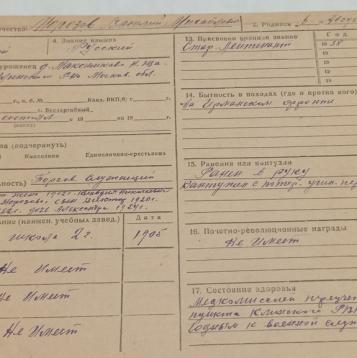 В 1934 г. работал сторожем контрольной будки и старшим по смене вахтёрной команде на заводе “Лаборприбор”.