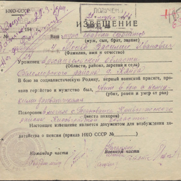 Фамилия Мосеев Имя Василий Отчество Иванович Дата рождения/Возраст 15.08.1904 Место рождения Архангельская обл., Беломорский р-н, д. Кянда. Дата и место призыва__.__.1941, Приморский РВК, Архангельская обл., Приморский р-н Последнее место службы 58 гв. сд Воинское звание рядовой Причина выбытия убит Дата выбытия 27.02.1944 Первичное место захоронения Украинская ССР, Днепропетровская обл., Криворожский р-н, с. Терноватка Название источника информации ЦАМО Номер фонда источника информации 58