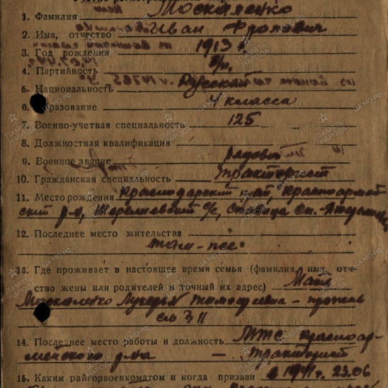 край, Красноармейский р-н, воевал в составе 175 сп, 02.03.1942г. был ранен.