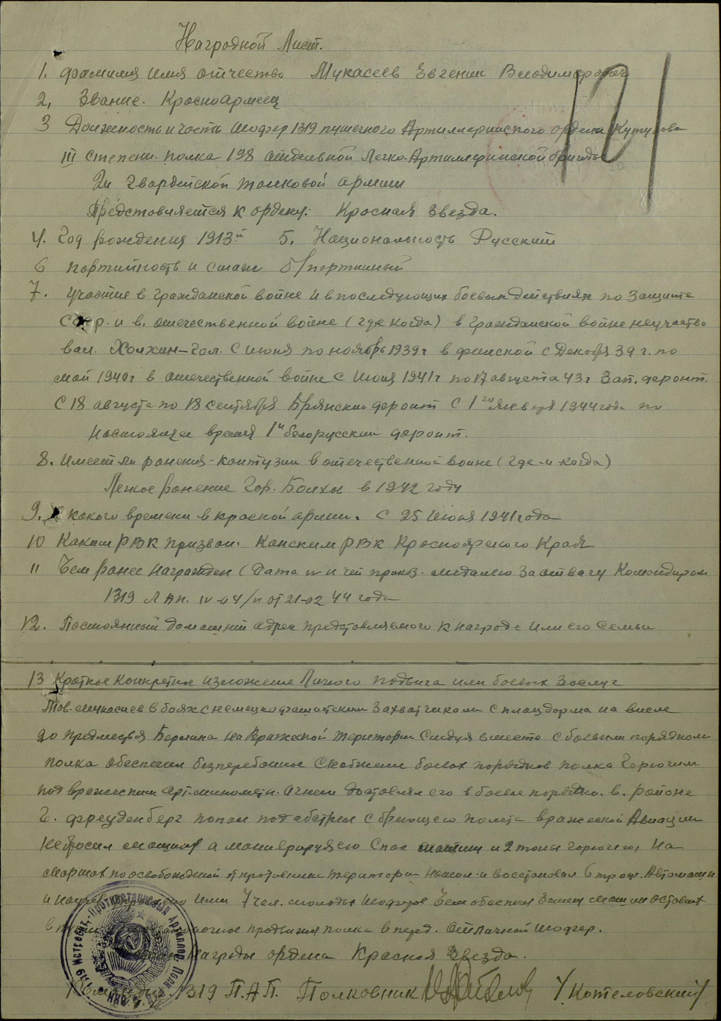 Мукасеев Евгений Владимирович воевал так же и на финской войне. Был призван 25 июня 1941 года в ряды Советской армии. Имел легкое ранение в 1942 году. Дошел до Берлина. Умер в октябре-ноябре 1983 года. Имел двоих сыновей.