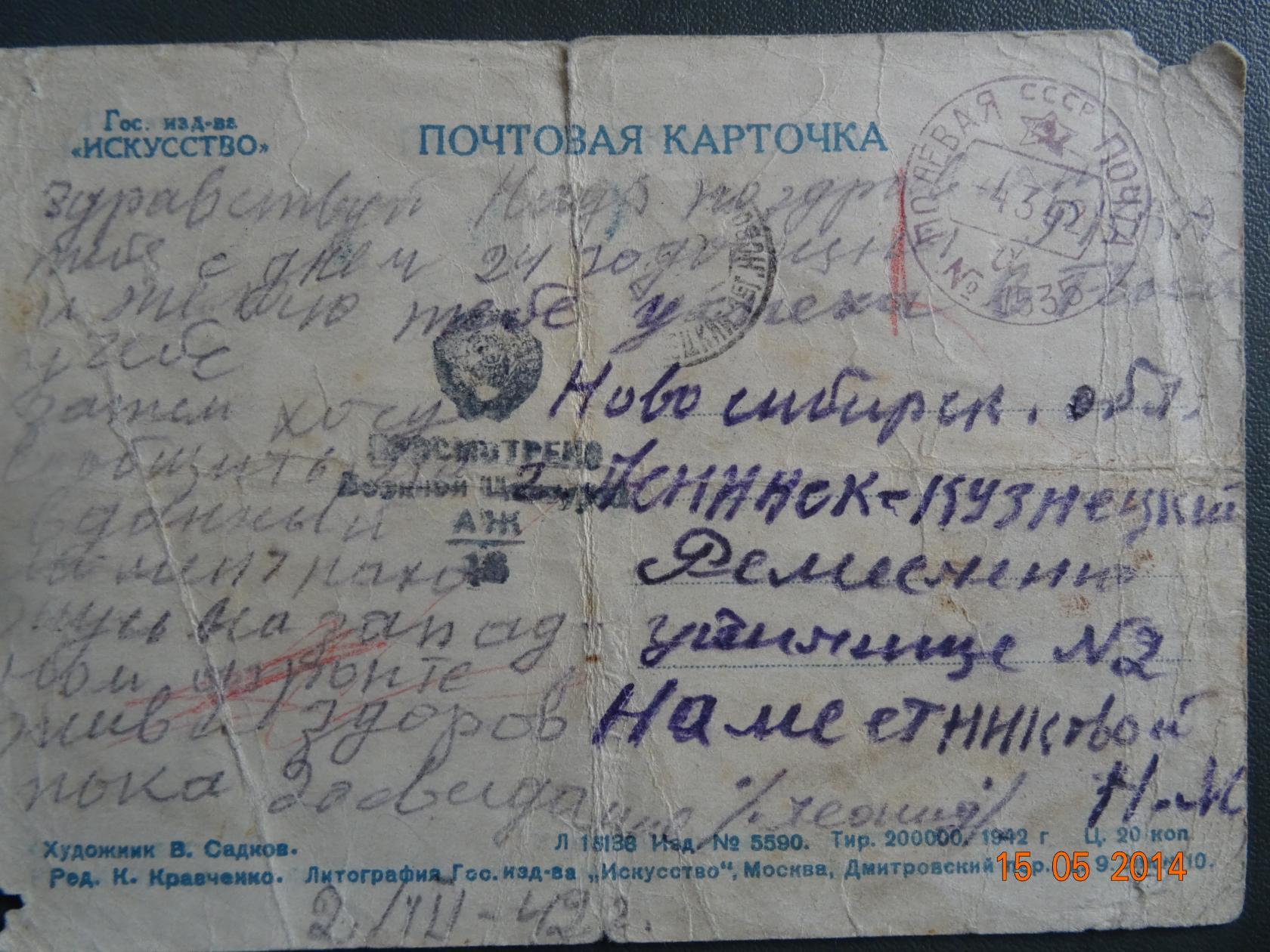 Был призван из Ленинск-Кузнецка. Последнюю открытку родные получили от 02.03.1942г., что жив и здоров, и находится на Западном фронте. Полевая почта 1535. Следом пришло сообщение от друга, что 04.03.1942 года Леня погиб. Он в лесу тянул связь и подорвался на мине.