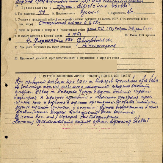 в разведке в звании гв. лейтенанта, часто ходил в рукопашный бой, отличался храбростью,
