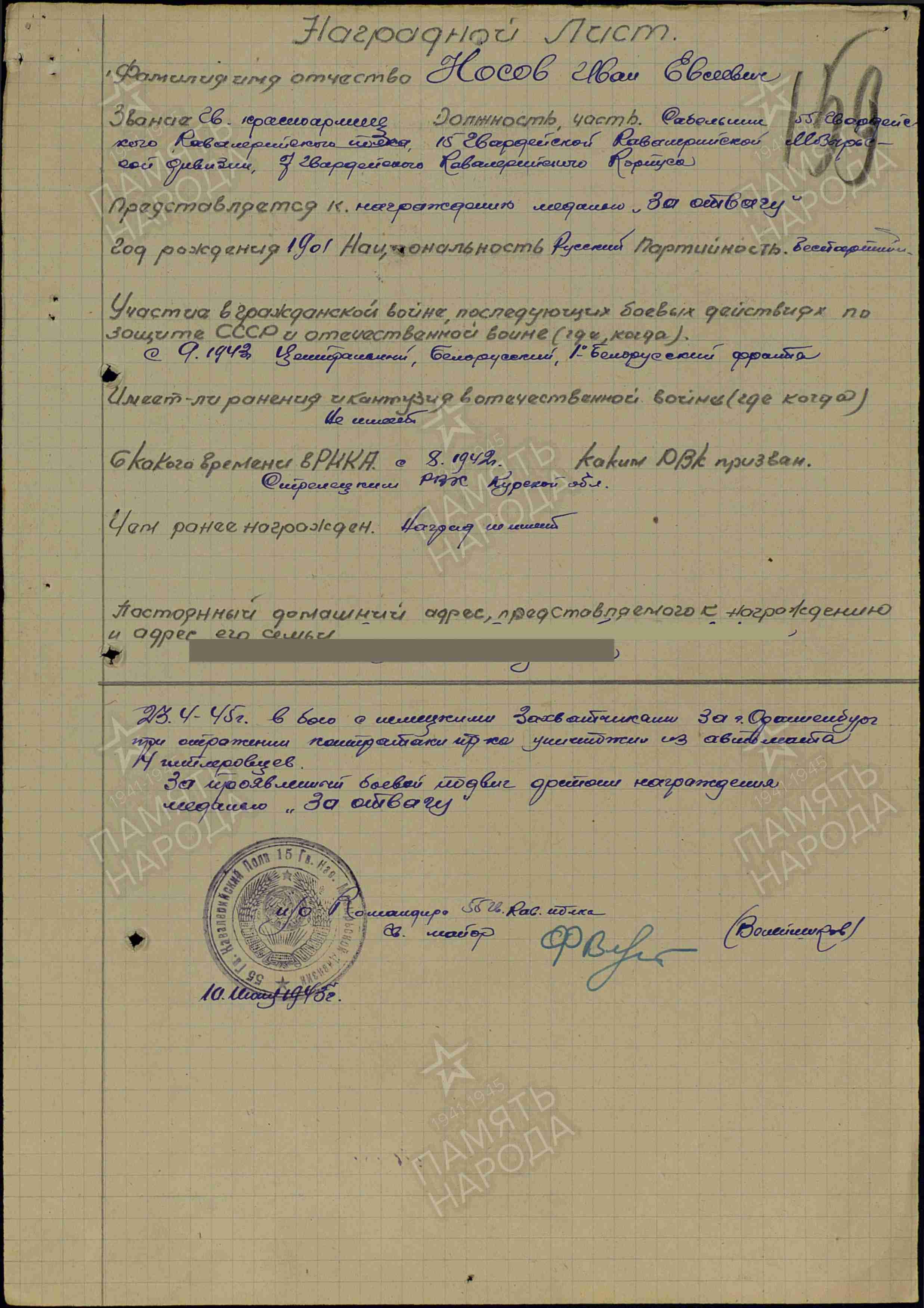 « В бою с немецкими захватчиками при отражении контратаки противника уничтожил из автомата четверых гитлеровцев. За проявленный боевой подвиг достоин награждения медалью «За отвагу».»