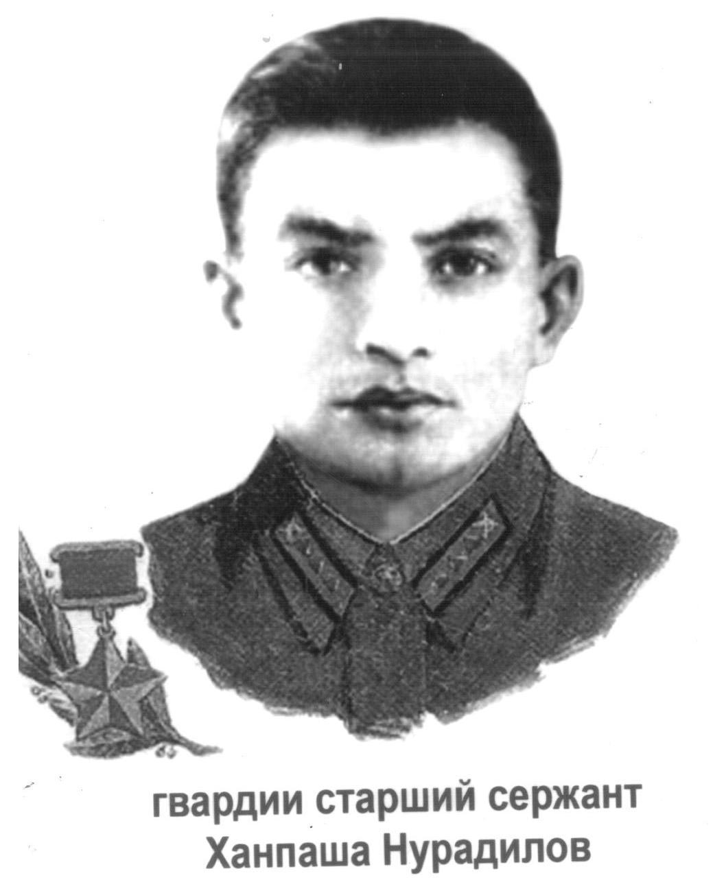 В этот критический момент на скатах безымянной высоты появился со своими «максимами» Нурадилов. Он меткими очередями скосил до сотни фашистов, вынудил гитлеровцев повернуть вспять. В это время Ханпаша получил ранение в ногу, но остался в строю. Противник перед новой атакой открыл сильный огонь. Пришлось сменить позиции. II когда немцы пошли вновь, Нурадилов встретил их губительным огнем. Враг не выдержал метких очередей и откатился назад. Рядом с Нурадиловым разорвалась мина. Осколок врезался в грудь. Рана оказалась смертельной. Товарищи бережно погрузили сто на повозку, но по пути в медсанбат Ханпаша скончался. Так прервалась жизнь замечательного патриота Родины, отважного пулеметчика, гвардии сержанта Ханпаши Нурадилова. Он самоотверженно сражался с ненавистным врагом. На его счету 920 уничтоженных гитлеровцев, 12 пленных, 7 захваченных пулеметов.